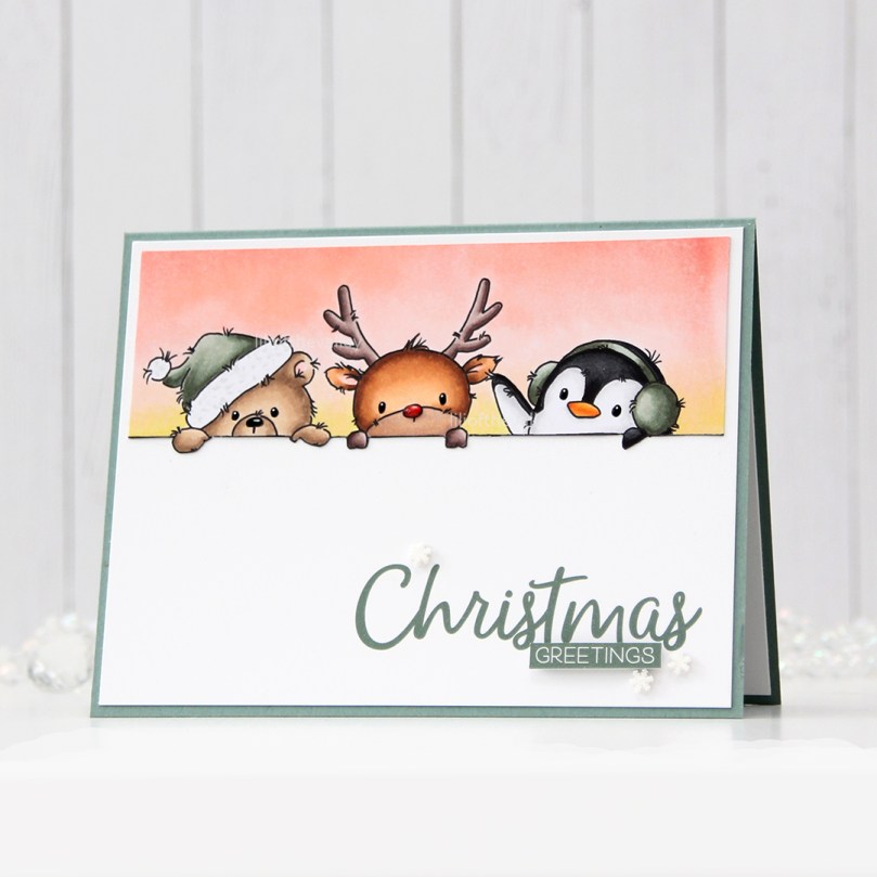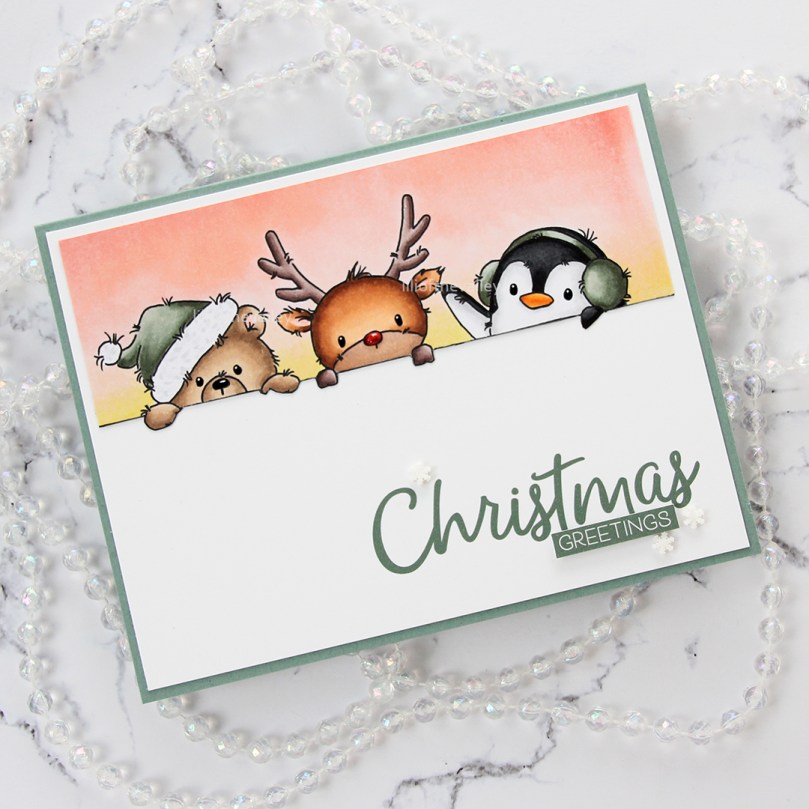 This cute image with the penguin, reindeer and bear peeking up from behind something stole my heart. It’s from the Snow Cute set, which includes another one of these peeking images and six individual penguins. I colored a winter sunset behind them before coloring the critters, used a black Glaze pen to make their eyes extra black and shiny and also put a dash of Glossy Accents to Rudolph’s nose. Once the layer of Glaze was dry, I added white dots using a 05 Gelly Roll pen.