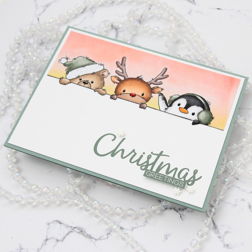 Hi, crafty friends! There’s a brand new release from Lili of the Valley right around the corner, and it’s a good one. It’s a beautiful Christmas collection of six different photopolymer stamp sets. There are penguins, polar bears, reindeer, a santa, some gnomes, snowflakes and a separate sentiment set. You know I can’t resist a cute penguin, and I thought I’d share a peek today.