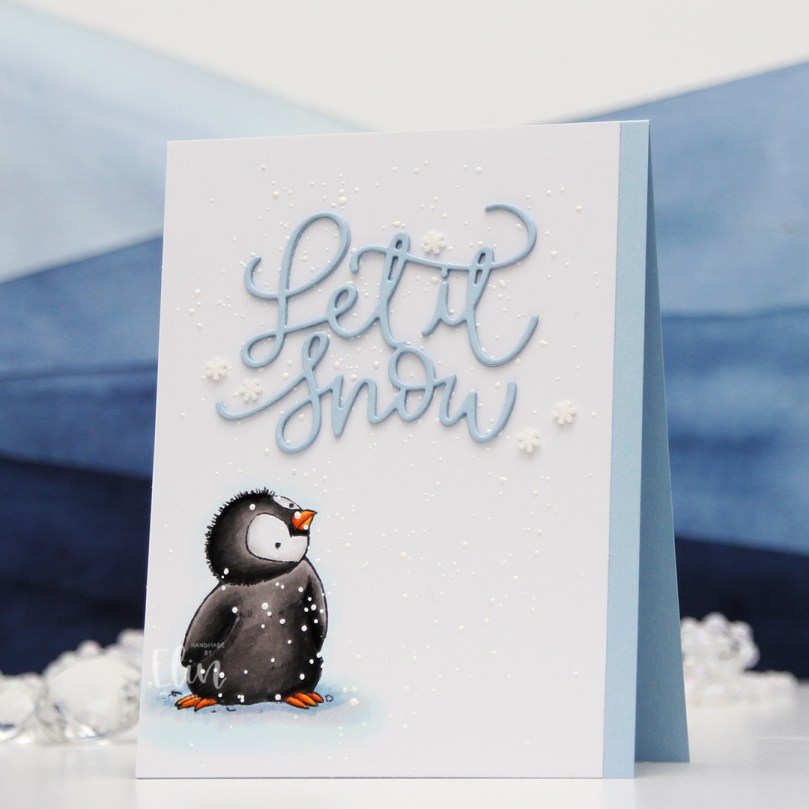 I colored the penguin very simply with my Copics, sprinkled on chunky white embossing enamel to my panel and added it to a top fold note card I created from Blue Breeze cardstock from My Favorite Things. I then die cut the Let it snow sentiment using a die from Mama Elephant. I die cut three layers of the same blue color cardstock and adhered them for a stacked look in the top center of the card before finishing off with a few snowdrift sprinkles from Little Things from Lucy’s Cards.