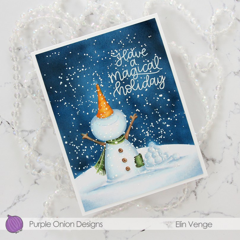 Hi, crafty friends. I hope you’re not tired of all my holiday cards yet, because I have another one to share today. This time, it’s featuring Jolly the snowman from Purple Onion Designs. He’s got to be the cutest, happiest snowman ever, right? I know I say that about all the snowman stamps I use, but this guy is special.