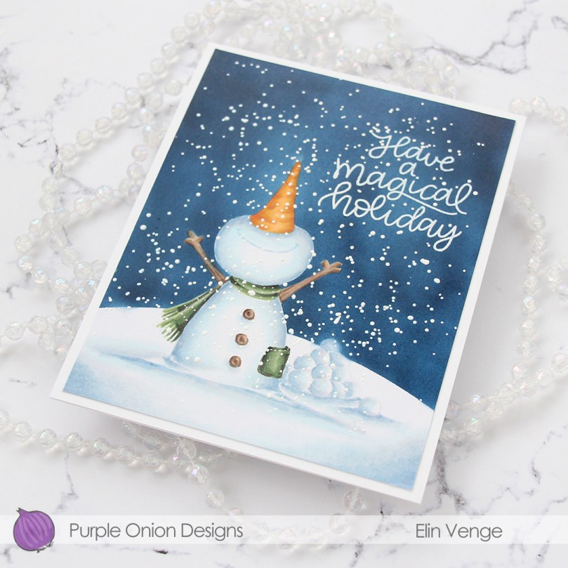 After I finished my coloring, I stamped and white heat embossed a sentiment in the sky. The sentiment is actually from the Scripty Xmas stamp set from Mama Elephant, I kind of forgot for a second that I was creating a Purple Onion card, I was a little lost in a creative zone. After heat embossing the sentiment, I sprinkled on chunky white embossing enamel from Stampendous to create my super snowy scene, making sure to remove any granules that landed on top of the embossed letters before melting the granules from the back.