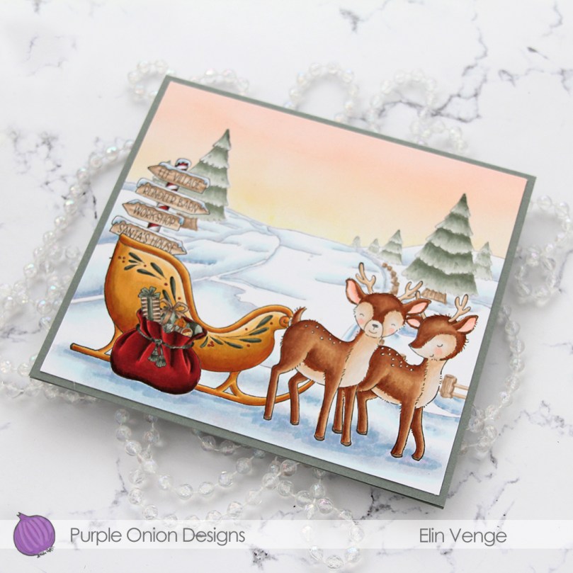 I wanted to make a peaceful scene for this card. I stamped and masked Dasher and Dancer, as well as Santa’s Sack, Santa’s Sleigh and the Destination Sign, before using second generation stamping with Memento Espresso Truffle ink for the Nordic road background.
