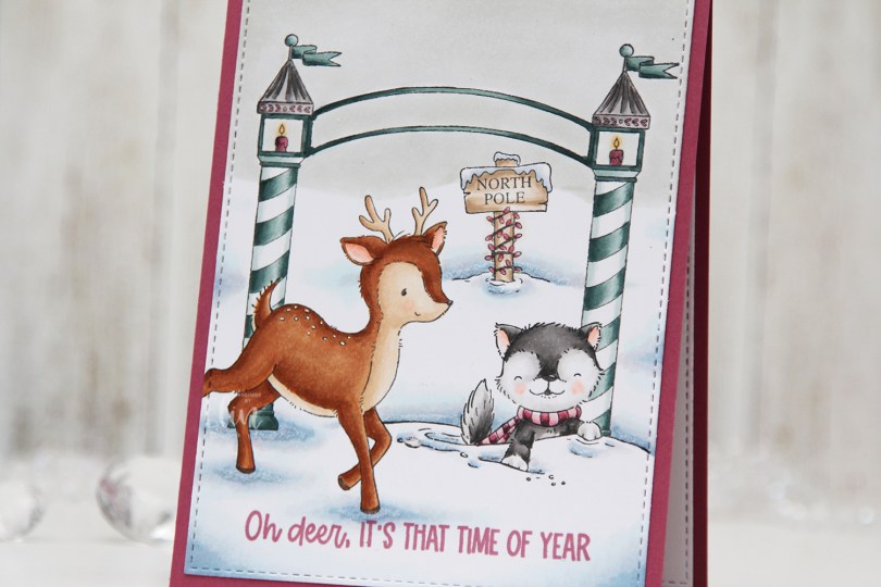 This time I’ve teamed up Prancer and Bluster in front of the Holiday Arch and the North Pole sign. I’ve done my best with the cards I’ve made using this release to change up the sky between cards. This time I went for an overcast look, and it’s all a very soft blue green color.