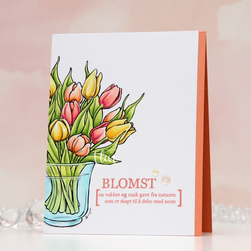 This More Tulips image from Mo is one I’ve used previously. This time I printed the image in its original size, cutting off a bunch of it on one side for a dynamic card design. I colored the image with Copics using a very soft color palette.