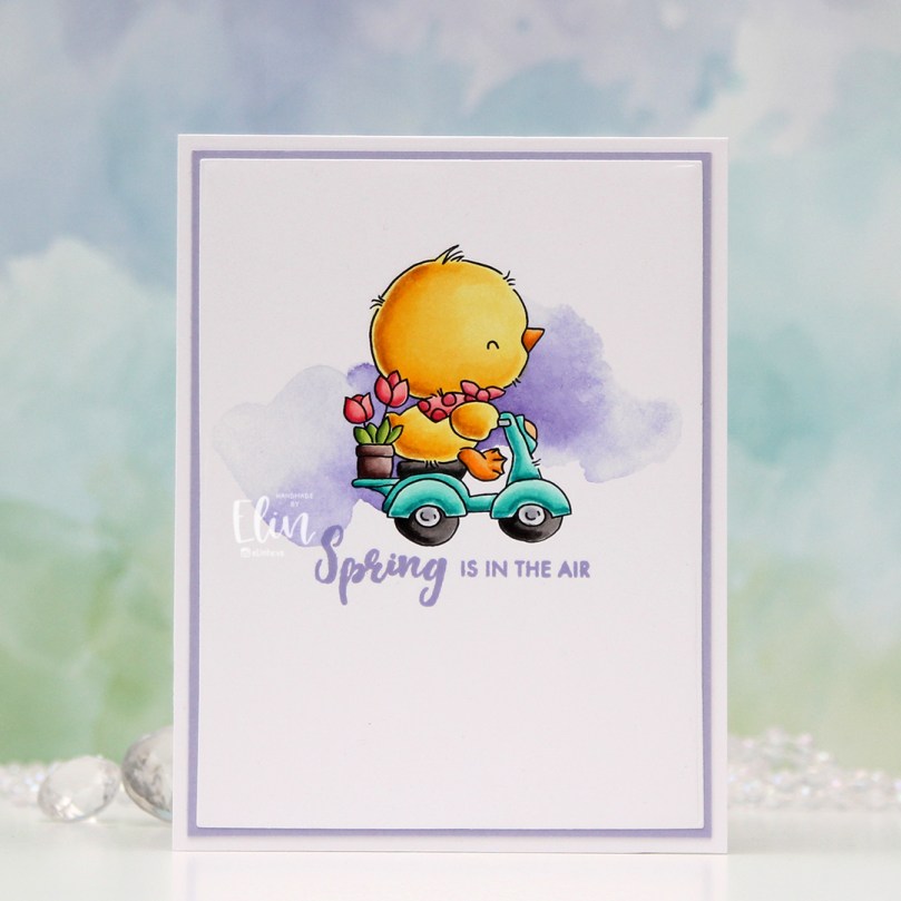 How adorable is this little bunny holding a bouquet of flowers? I definitely used spring colors for this, and even went complementary with my Copics. I’m not really a fan of complementary colors, so I tend to stay away from them, but it worked for this card. Adding the green watercolor in the background helps too, that way the purple and yellow aren’t competing as much for the attention.