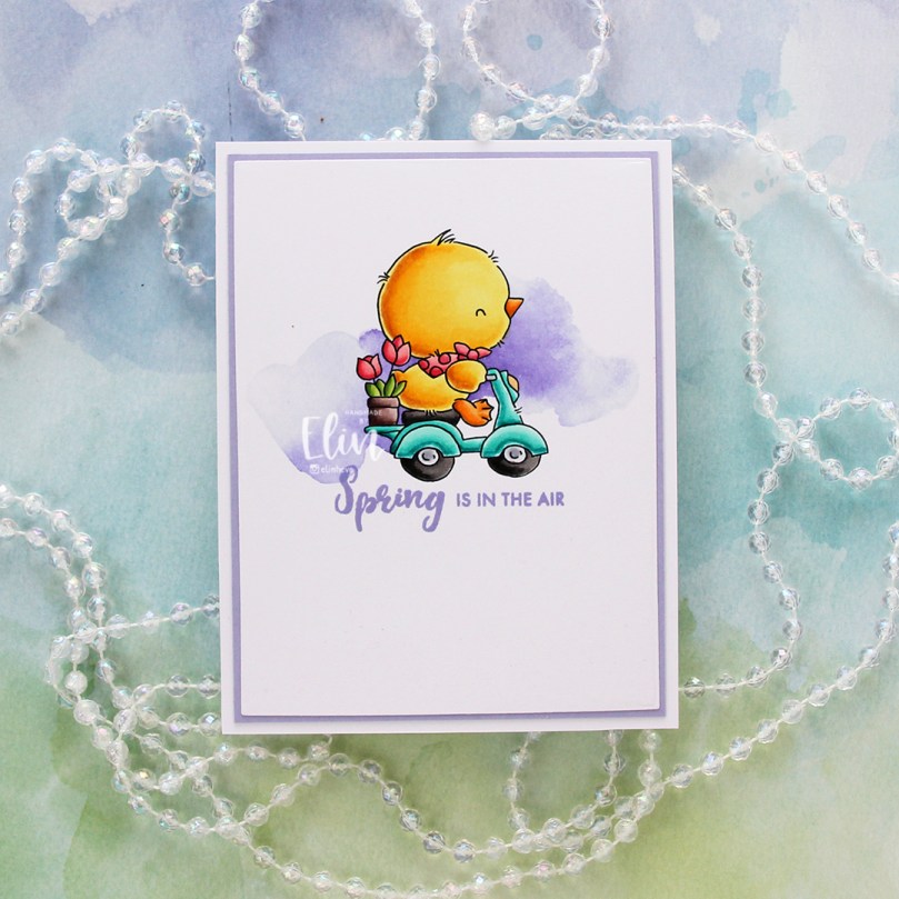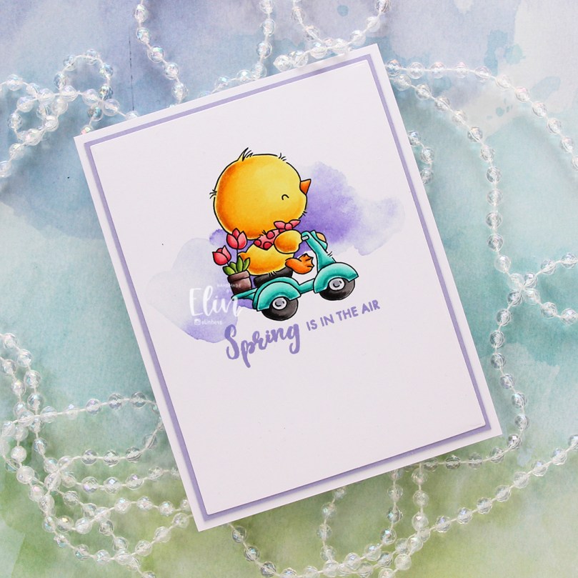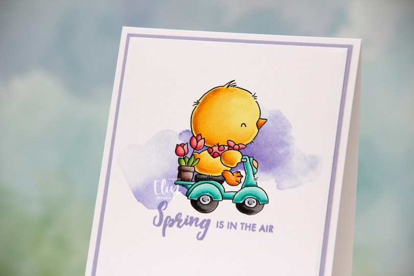 How adorable is this little bunny holding a bouquet of flowers? I definitely used spring colors for this, and even went complementary with my Copics. I’m not really a fan of complementary colors, so I tend to stay away from them, but it worked for this card. Adding the green watercolor in the background helps too, that way the purple and yellow aren’t competing as much for the attention.