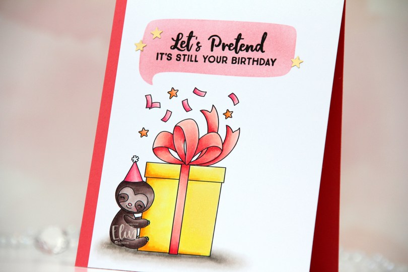 Once my coloring was complete, I ink blended Berry Sorbet and Melon Berry inks into one of the openings in the Say Anything stencil from My Favorite Things, before stamping a sentiment from the Anything-but-Basic Birthday Wishes stamp set (also from MFT) using VersaFine Onyx Black ink.