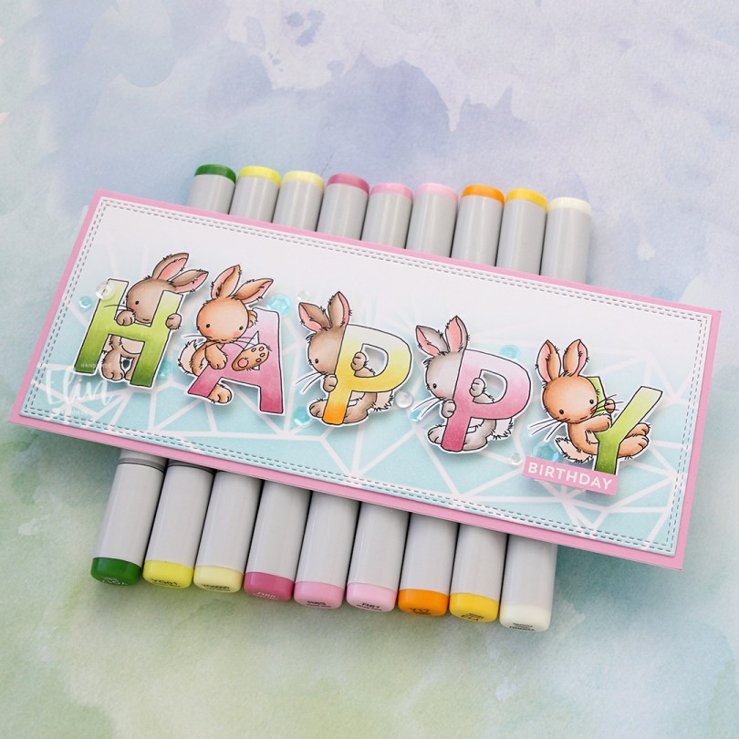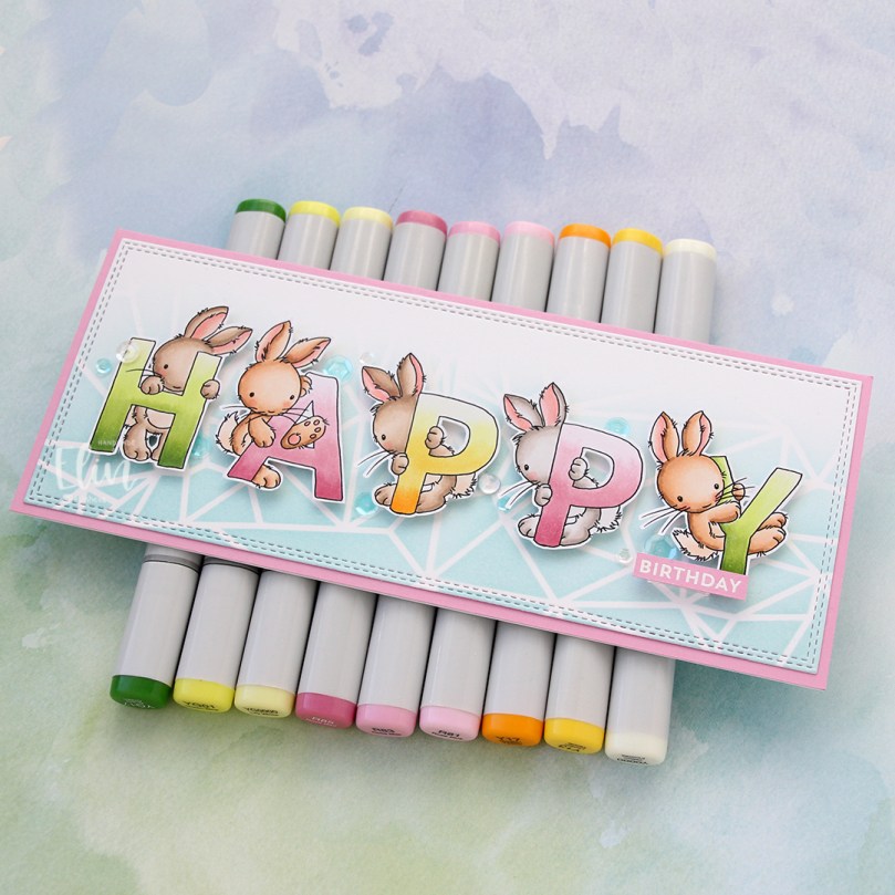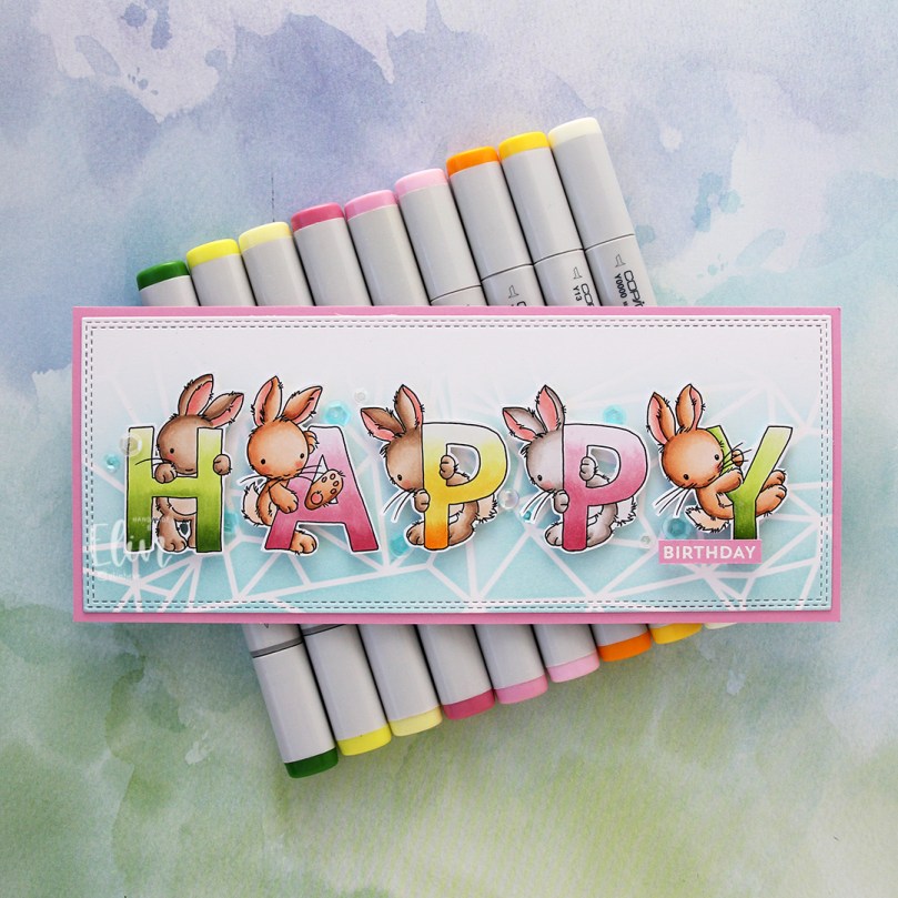 Hi, crafty friends. I’m here today sharing a slimline card, featuring the new Bunny Alphabet stamp set from Lili of the Valley.