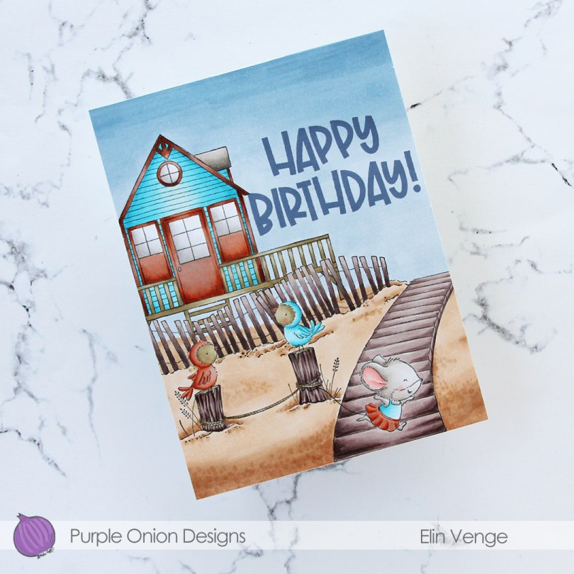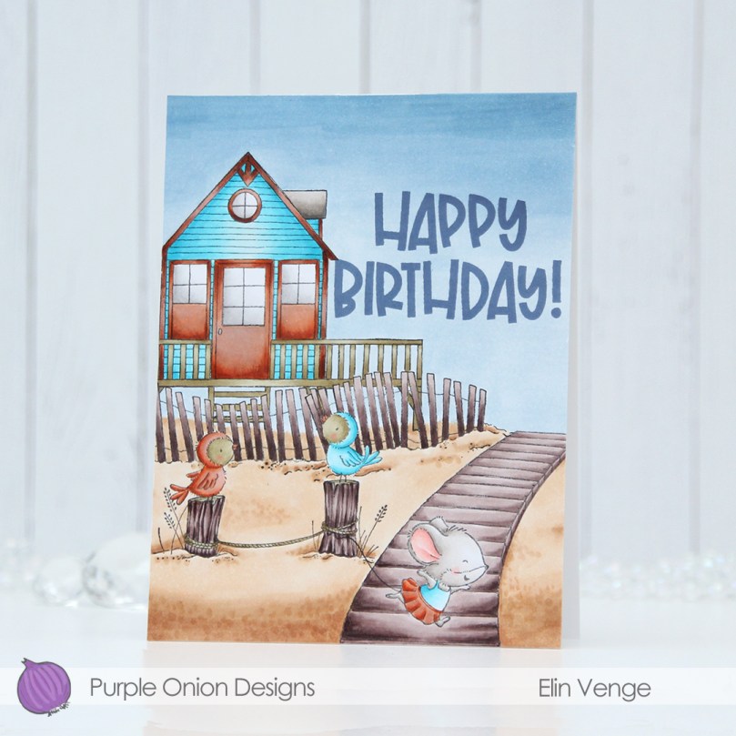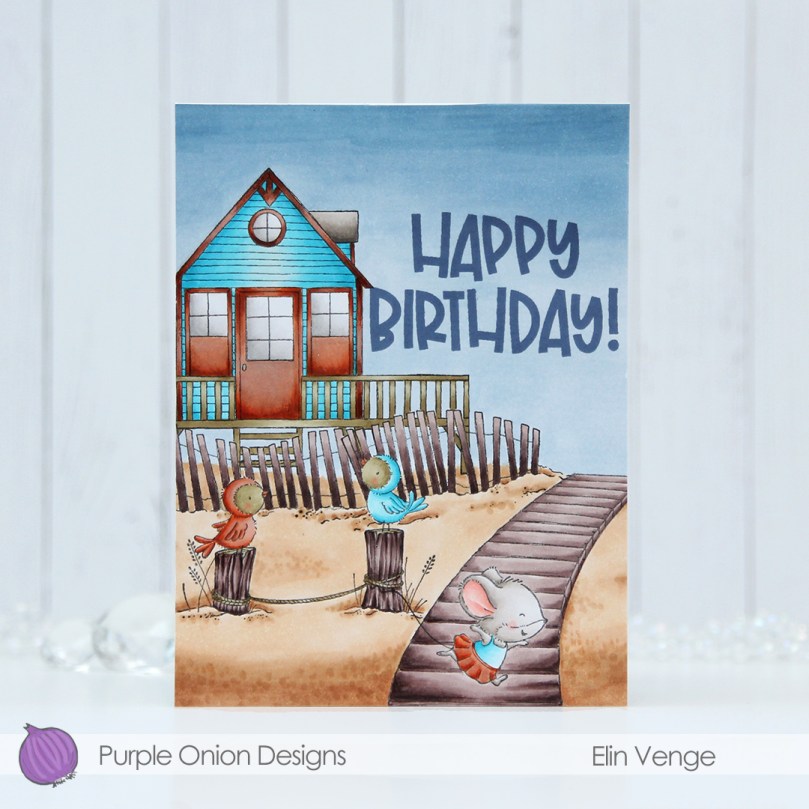 This time, I made a birthday card. I stamped and masked Iris (running mouse), Tweet & Chirp (twin birds), the wood posts, the boardwalk and beach fences and finally stamped the beach house in the background, all using Extreme Black ink from My Favorite Things.