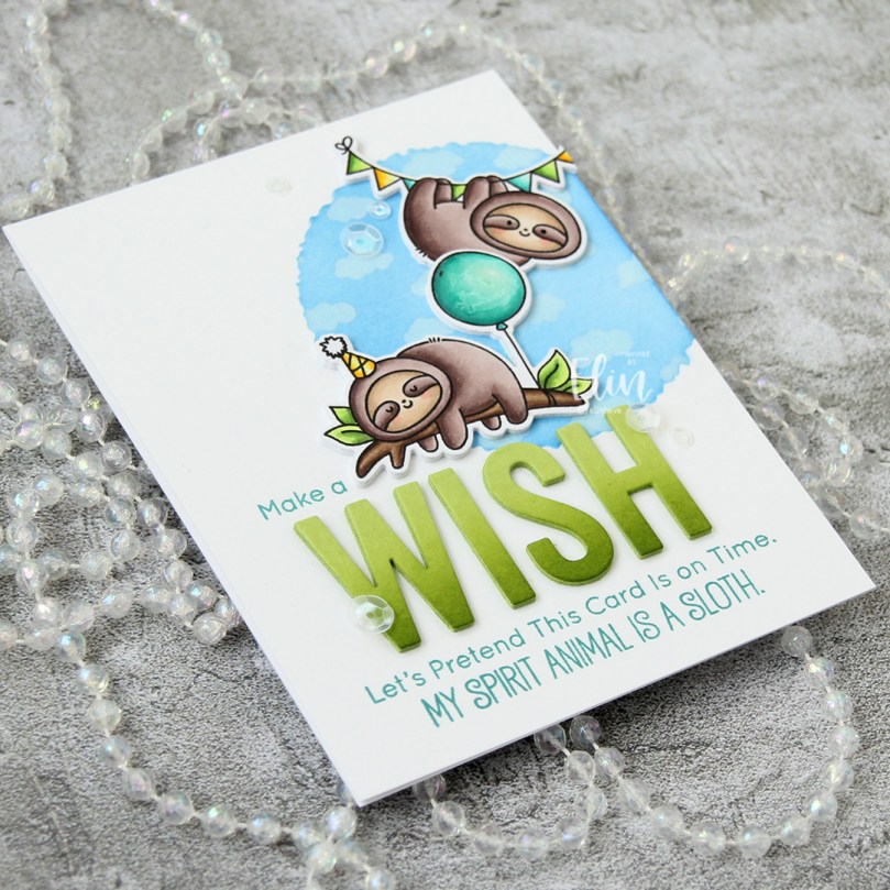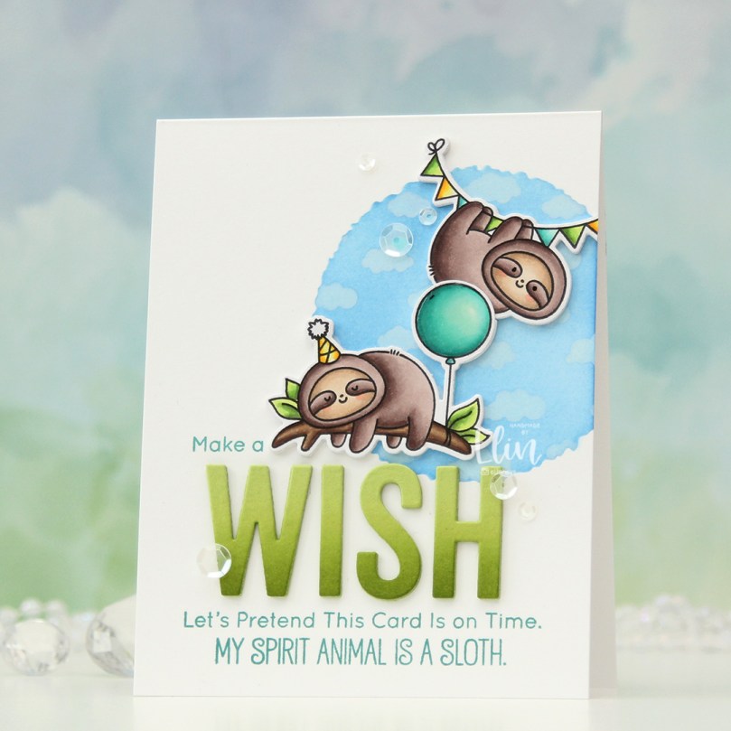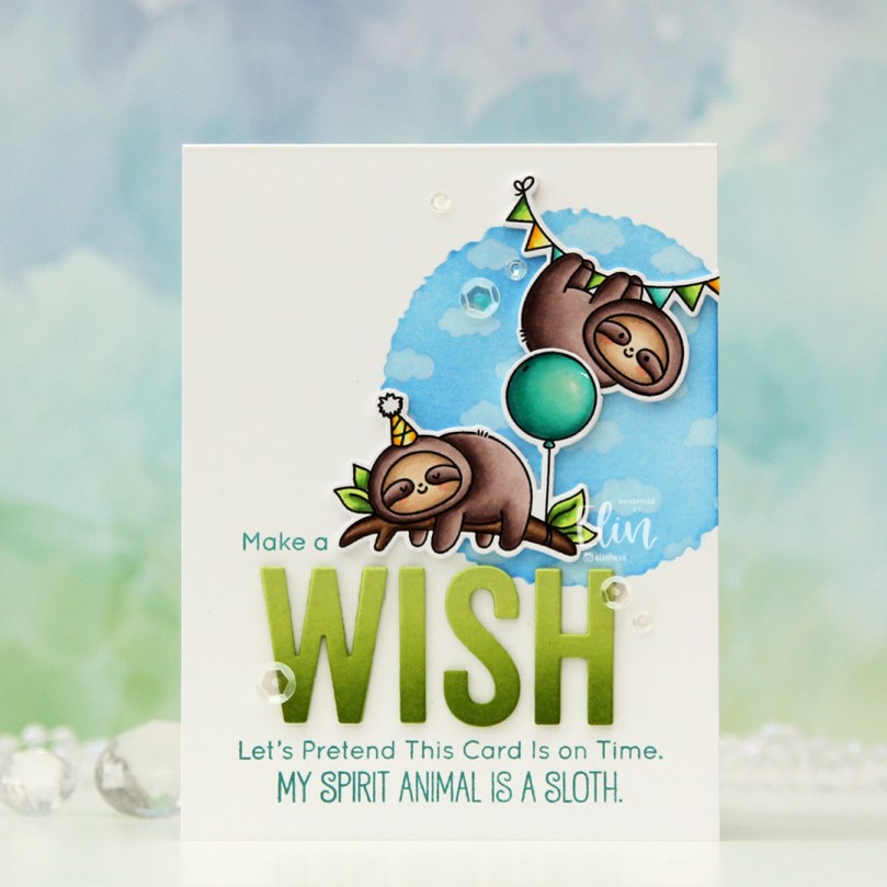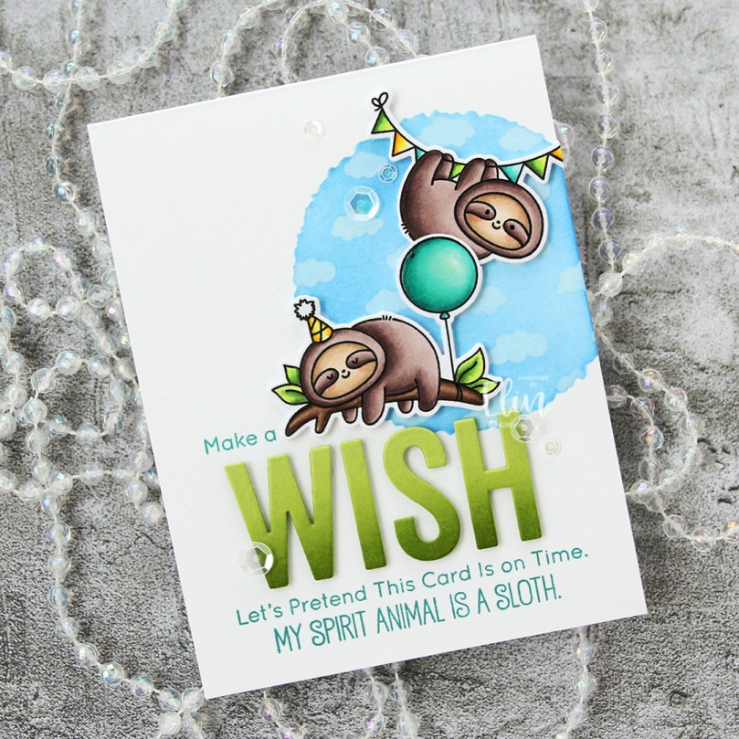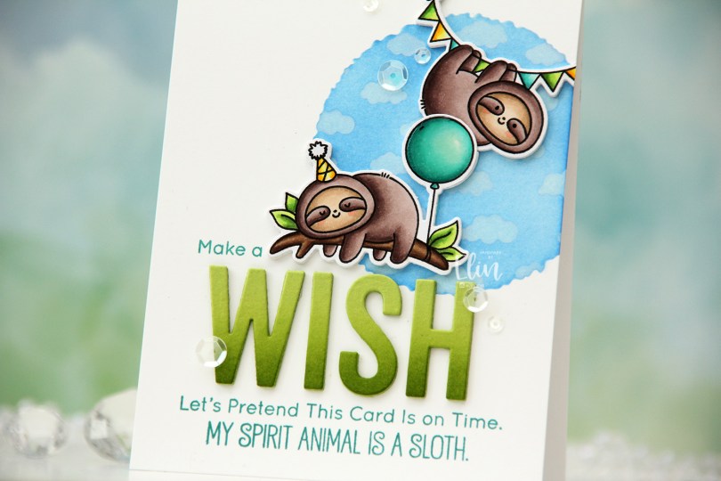 At the bottom center of the card, I stamped a sentiment from the stamp set with the sloths, this time using Caribbean Sea ink from My Favorite Things. I also stamped “Make a” from the older Birthday Chicks stamp set and adhered die cut letters between my stamping to complete the sentiment. I die cut the word with from the Wish Big Today die that also came out in the July release from My Favorite Things (it was such a good release). I used Sour Apple cardstock, and at the base of the letters I ink blended using Sour Apple ink, and a little bit of Jalapeño Popper ink for extra oomph. I put three additional die cuts behind each letter and adhered them to my card.