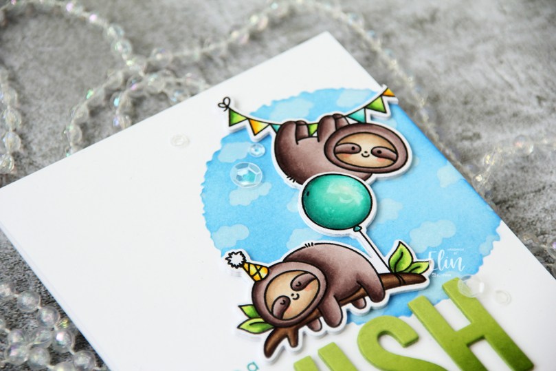 Time for the sloths. I die cut three additional layers of cardstock to go behind each of my die cut sloths, and glued them directly to the card base. I cut off a portion of the balloon on the back layers, so I could overlap the colored one with the other sloth. I added a dot of black glaze pen to the eyes of the sloth that’s awake, and Glossy Accents to the balloon for a bit of shine.