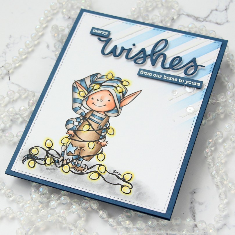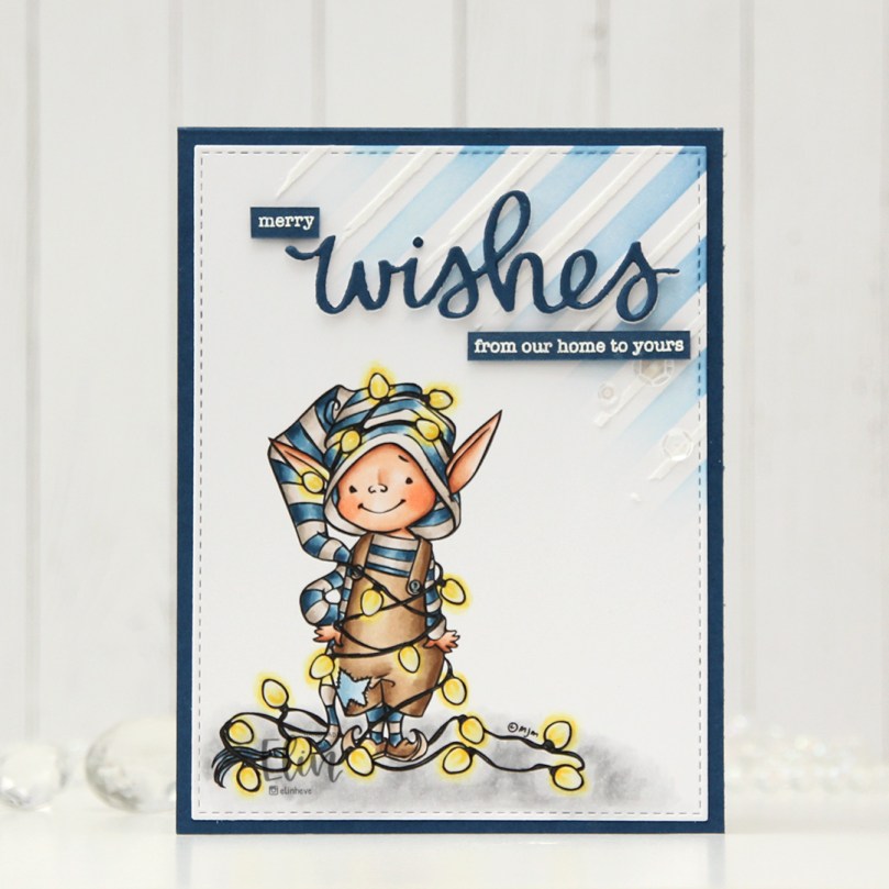 I adhered my panel to an A2 top fold card base I created from Enchanted Evening cardstock from Papertrey Ink. Using the scripty wishes die from Mama Elephant, I die cut three layers of white and one blue on top for a stacked look and adhered it on top of my stenciled background. I also stamped and white heat embossed a couple of sentiments from the Holiday messages stamp set from Mama Elephant to add to the wishes to make my sentiment complete. I cut them down to strips and added a few layers of cardstock behind each of them for dimension, before finishing off the card with a few sequins from the Starry Night mix from Little Things from Lucy’s Cards, as well as Glossy Accents for the lightbulbs.