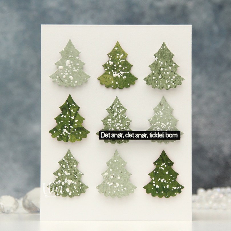 I die cut a tree nine times from three different shades of green patterned paper. The two lighter ones are both from Maja Design, while the dark one’s from Kaisercraft. This die is pretty small and perfect for scraps. There’s also a die in the sets that cuts the trunk, but I decided not to use that for this card.