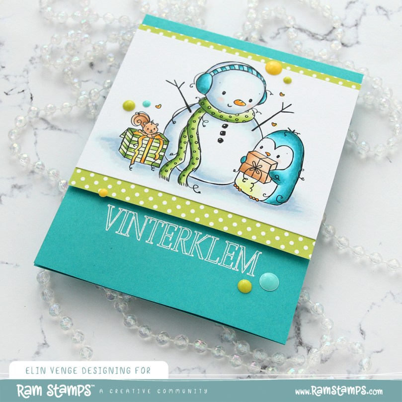 Hi, crafty friends. I have a fun winter card to share today, featuring the Christmas Gifts digi stamp from Rachelle Anne Miller. I went a little untraditional in my color palette for this one.