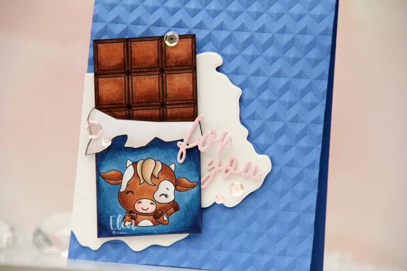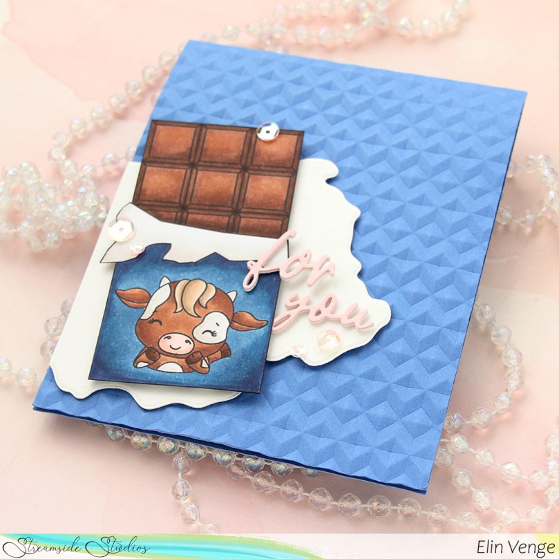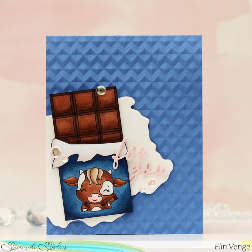 Hi, crafty friends. I have some chocolate for you today. Well, a paper chocolate, featuring the Chocolate Covered Strawberry Cows digi stamp set from Streamside Studios. This set has five cute cows, a chocolate bar and a bunch of other little accessories that you can use. I replaced the heart and the text on the wrapper for my chocolate, and put one of the cows there instead. This sort of mimics a Stratos chocolate bar, and that’s the look I was going for.