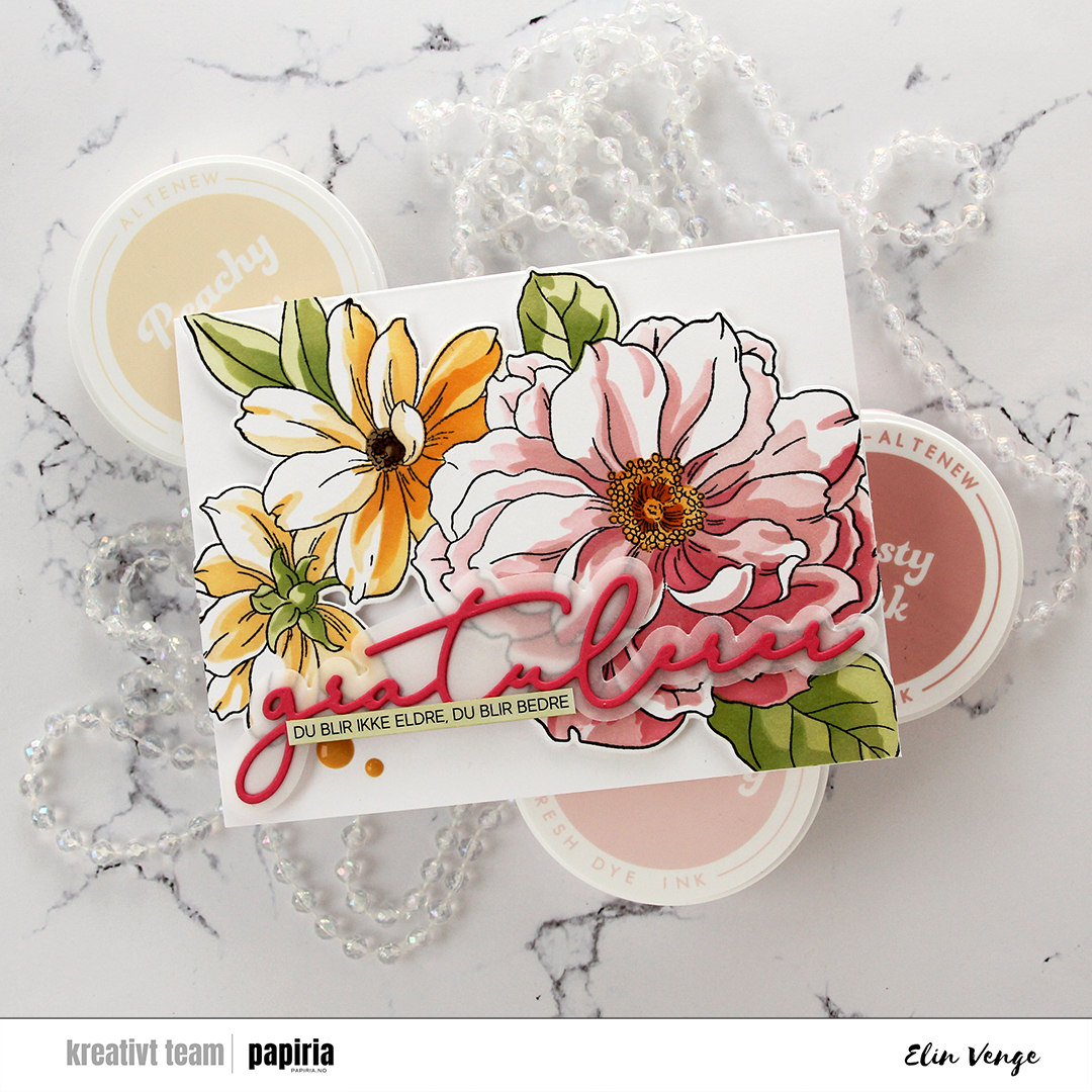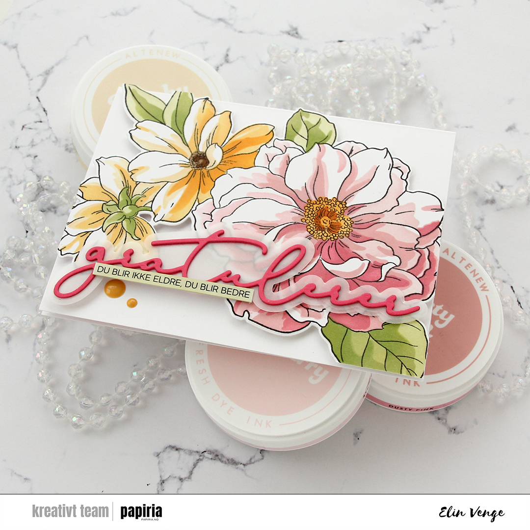 Using a die set from Kort & Godt, I cut the word gratulerer a few times from Honeysuckle cardstock from Concord & 9th, and the shadow layer from 40 lb vellum. I stacked two of the pink on top of the shadow and another two behind the shadow, giving it a little bit of lift off the flowers.
