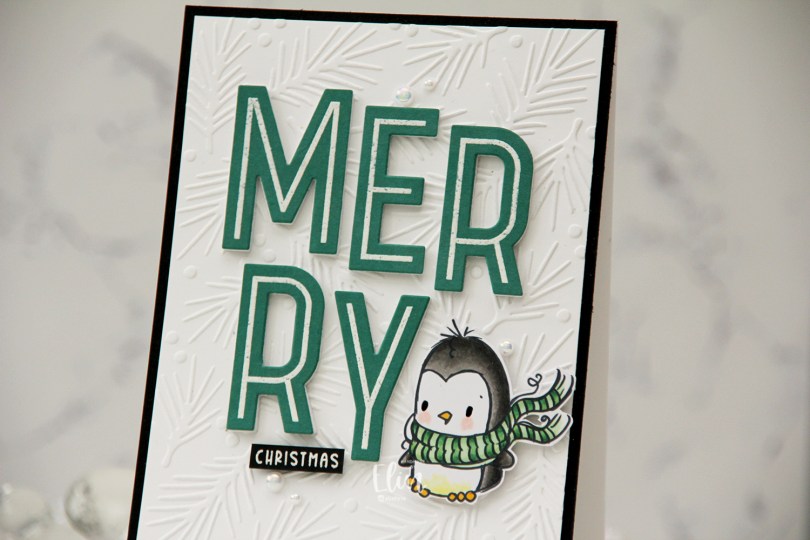 I used the Berries & Boughs embossing folder from Concord & 9th to create a little bit of interest to the background. I trimmed my white dry embossed panel slightly and adhered it to a black cardstock panel that I adhered to a top fold white card base. I arranged my merry letters on the front of the card, added my penguin with foam tape and also added a white on black heat embossed sub sentiment from the Christmas Greetings stamp set from Lili of the Valley.