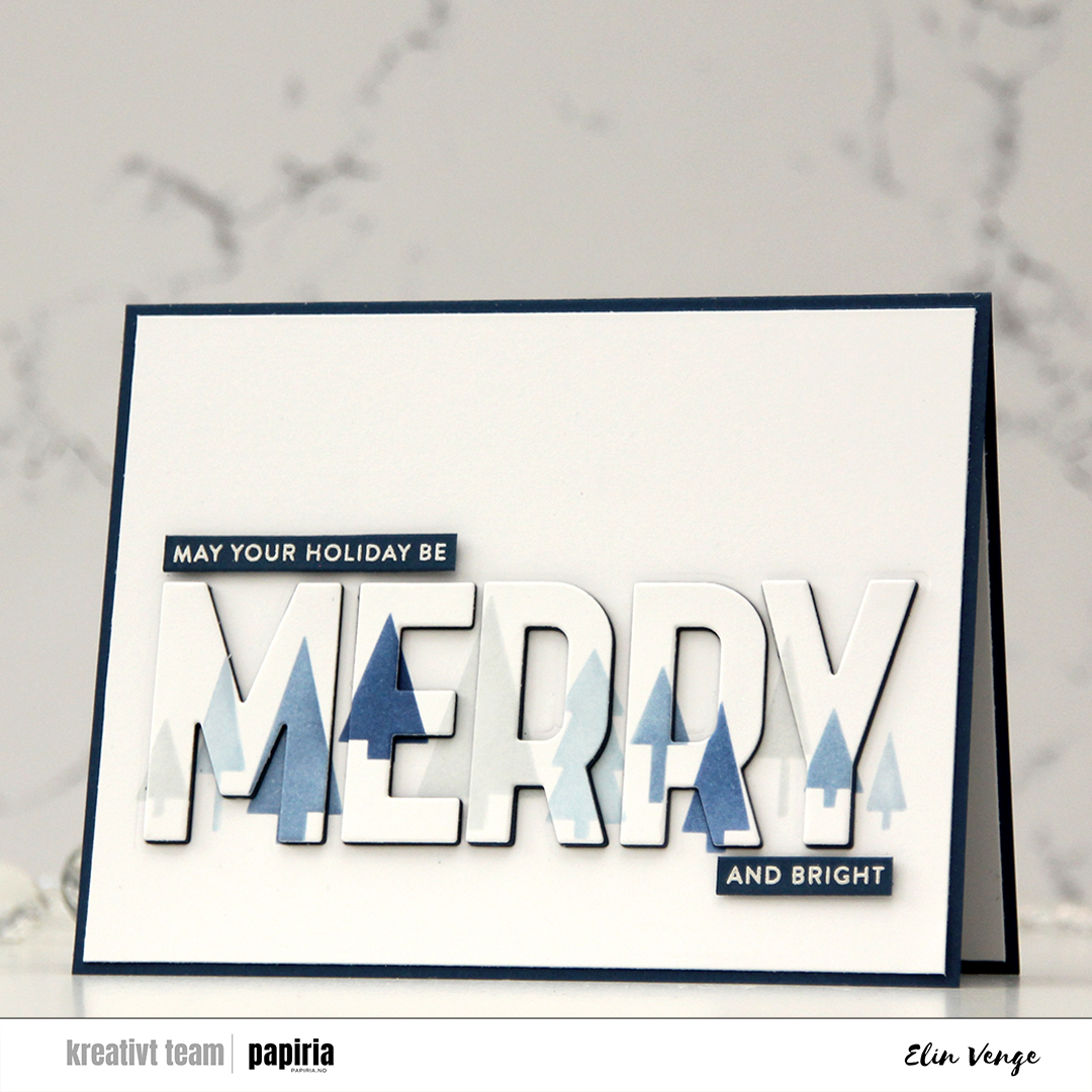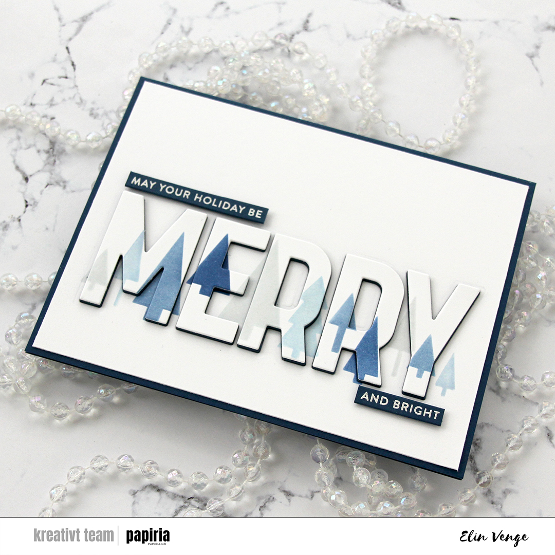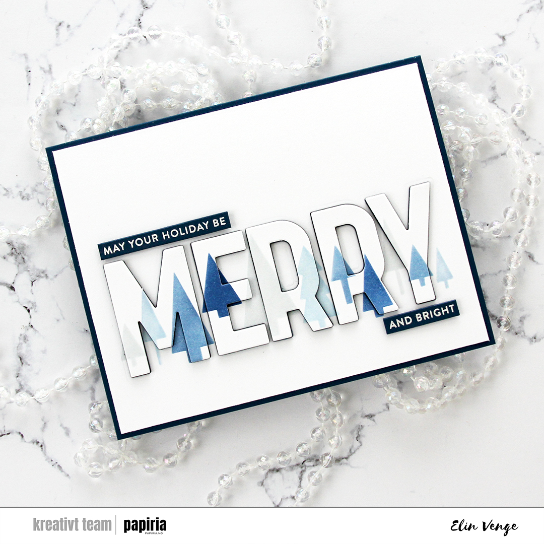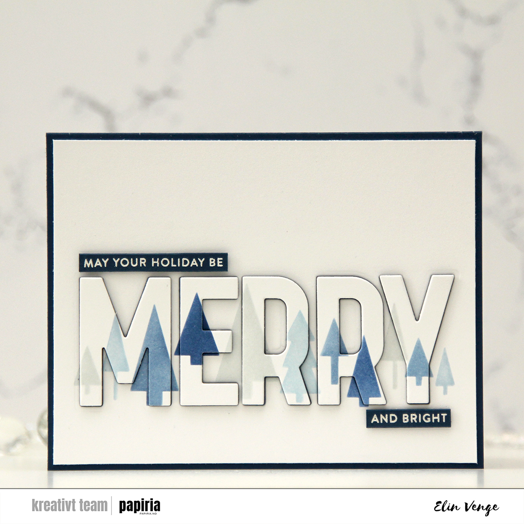 Using the Merry Trees die set, I took the big MERRY die and die cut it straight out of my ink blended trees. I also die cut an additional four layers of using After Midnight cardstock from My Favorite Things. I cut off a little on each side of the white panel, adhered it to a card base in that same dark blue color and puzzle pieced the letters back in. The fact that they’re stacked with a dark color makes the word easier to read than if I’d used white to stack.