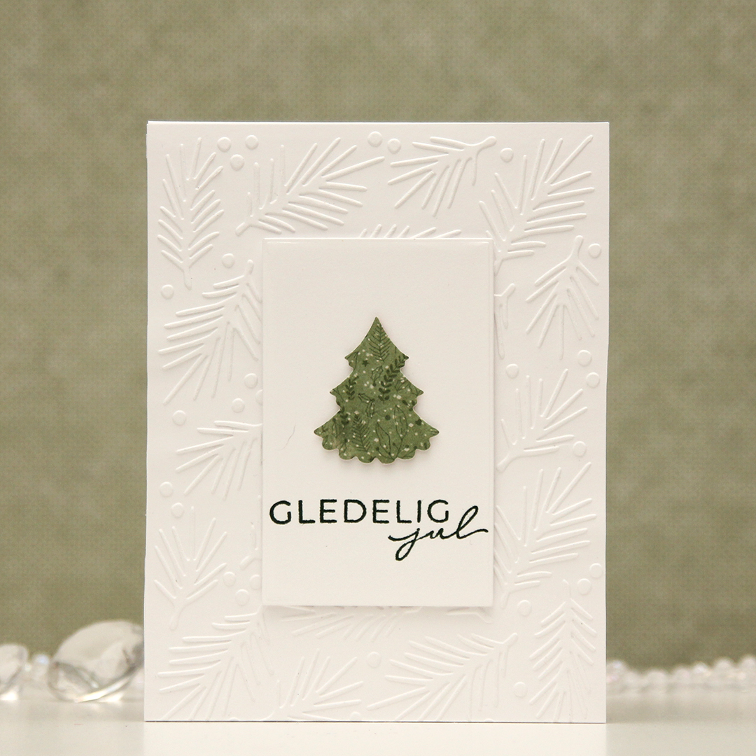 I added a few layers of cardstock behind my white rectangle for dimension and used one of the dies from DIE 323 from Kort & Godt for my tree. I cut it from a scrap of patterned paper from the Happy Christmas collection from Maja Design, added some dimension on the back of it and adhered it above the sentiment. Super simple, right?