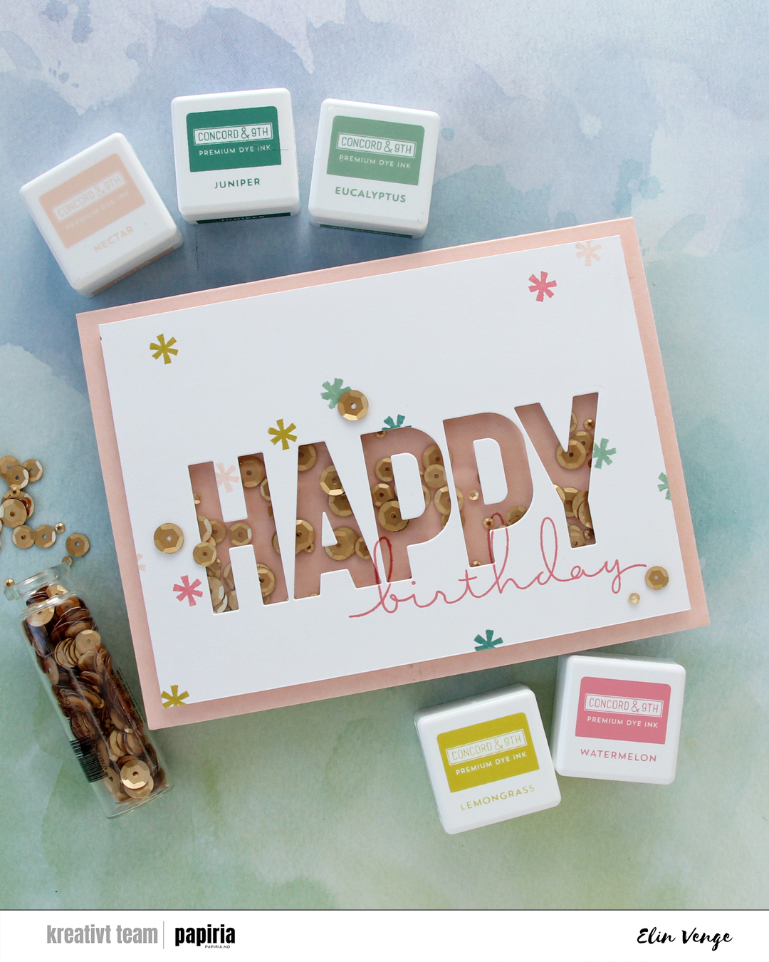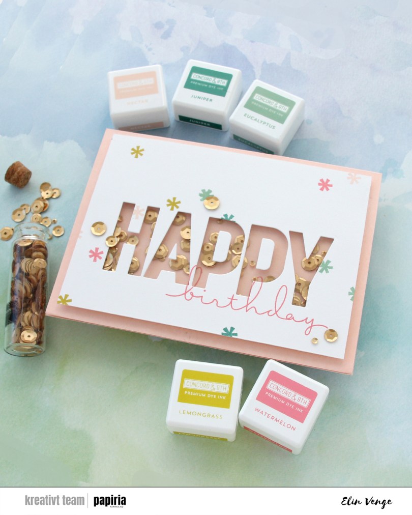 So many things went wrong in the creation of this card, but I fixed/covered up most of my mistakes and I’m pretty happy with the end result. I started by stamping birthday from the All the birthdays stamp set from Concord & 9th onto an A6 panel of Stamper’s Select White cardstock from Papertrey Ink, as well as onto a piece of Nectar cardstock from Concord & 9th that was large enough to cover the shaker area. I didn’t want to stamp it directly onto the card base, that would have made it harder to line up. More on that later. So far, so good, right? I then die cut the HAPPY from the Happy Birthday words dies from Kristina Werner into my white panel, and kept the counters of the A and the Ps to put back in later. Things were still going according to plan. There’s a small asterisk looking stamp in the All the birthdays stamp set. I wanted to stamp that randomly across my white panel and pulled out an acrylic block. We used to stamp with acrylic blocks all the time before the Misti was invented. I’m not a ding dong, surely, I’m capable of stamping this tiny stamp a few times with an acrylic block without messing up, right? Turns out I AM a ding dong and royally messed up on the Eucalyptus colored asterisk above the A and P. Pretty much in the middle of the card, isn’t that typical? I knew I was going to add sequins, and I could strategically place one to cover up my boo boo. I cut off 3/16″ on all sides to allow the card base color to work as a frame once the card was complete.
