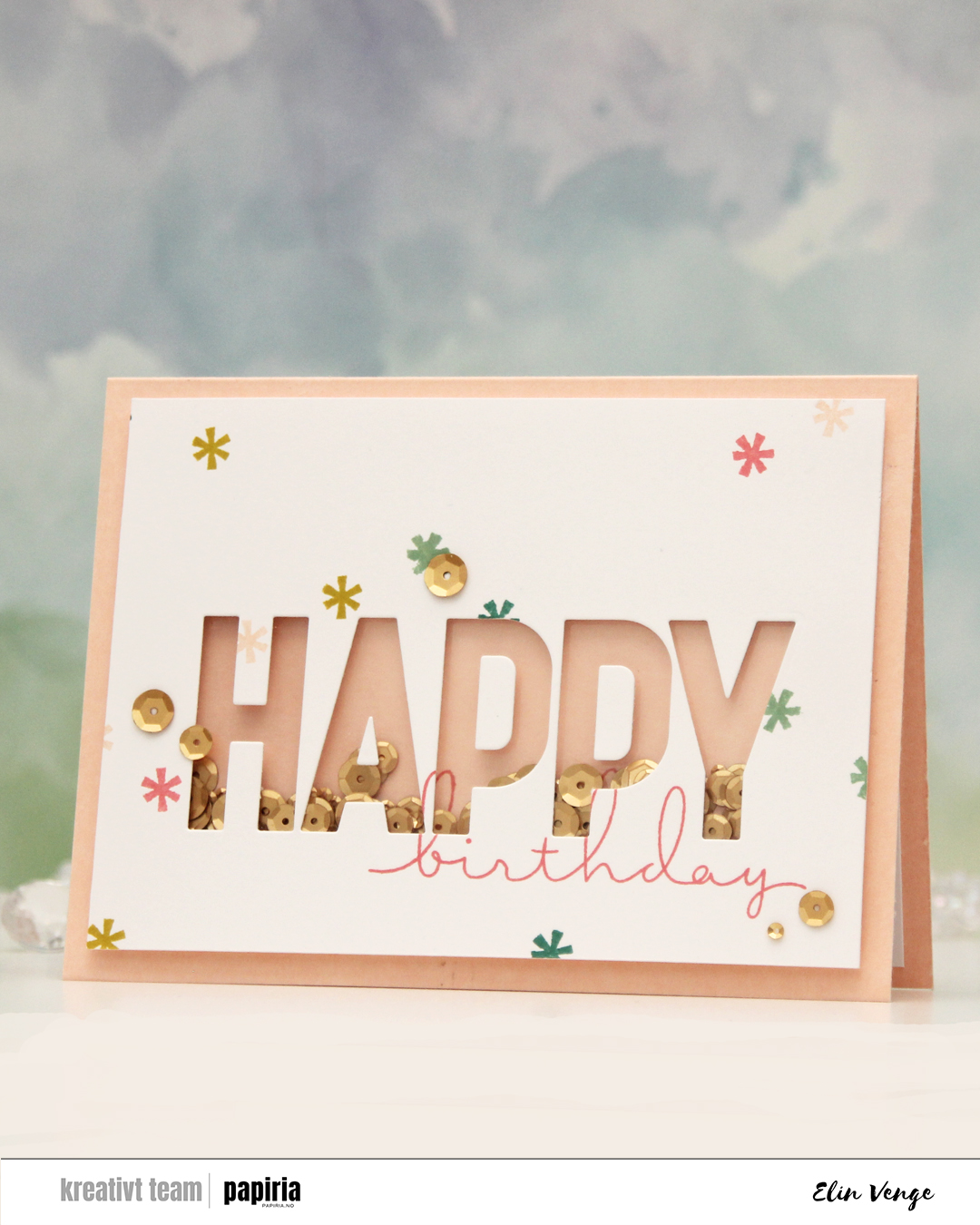 I adhered my shaker panel to the card base and cut a couple of additional white panels to put on the inside of the card. This means I have a white panel to write my personal message, the card is a little sturdier because it’s now thicker, and the piece I adhered on the back of the front covers up the fact that I could actually see through parts of the card base after my little sawing earlier. Not shy about glue, remember? Yeah, the glue does its job, and I tore parts of it down to almost printer paper thickness. I added sequins to the front of the card (one covering up my stamping mishap) and I was done. At least I thought so… I was happy with the card, but then noticed as I was writing up the blog post for Papiria that the counter of the second P had slipped a little and wasn’t in the right spot anymore. It was bugging me. It was *really* bugging me, so I peeled it off, die cut a new one that I adhered in the right spot and took a couple of new photos. You can still see the droopy counter in the first two photos here, but that’s my card. I got there in the end.