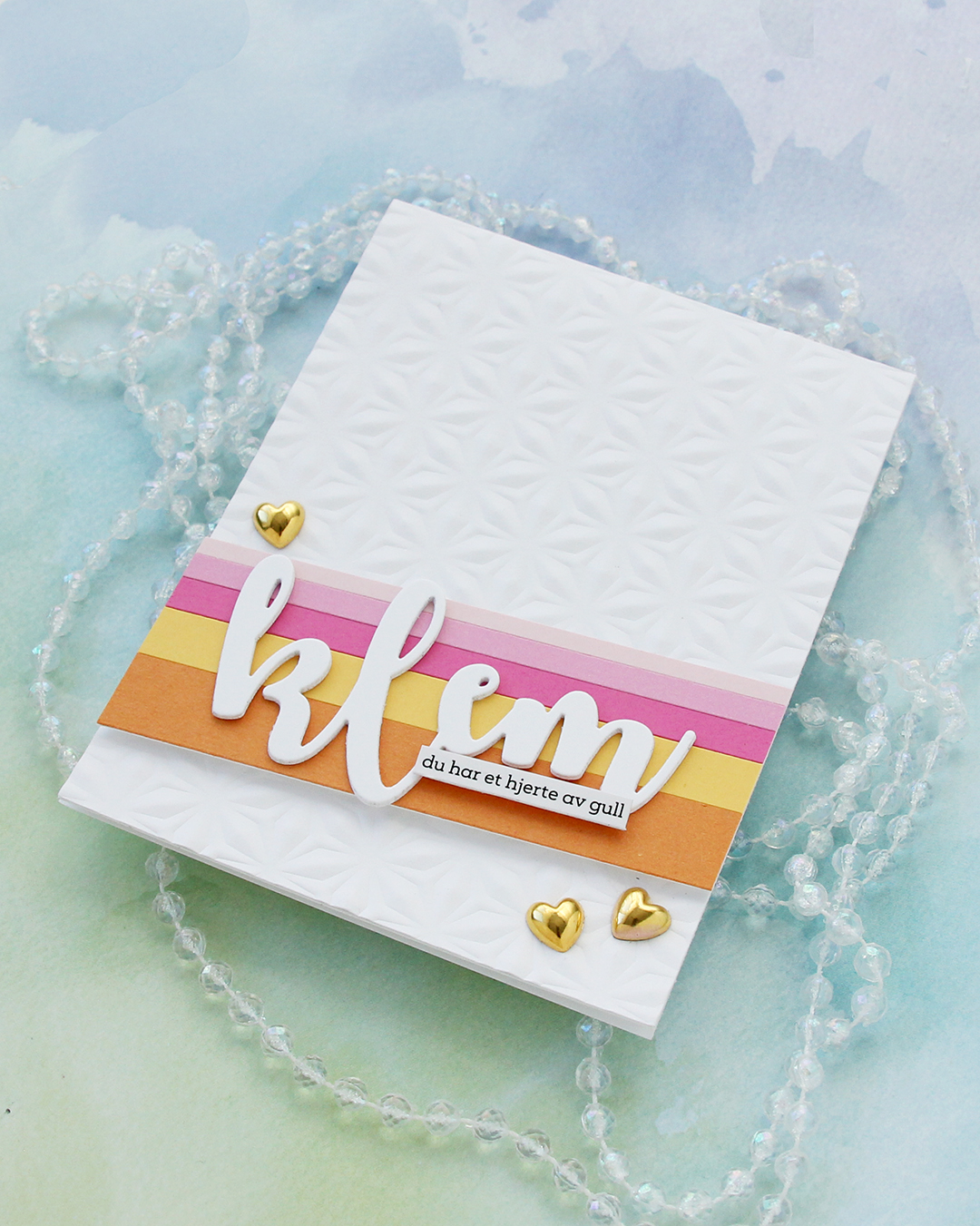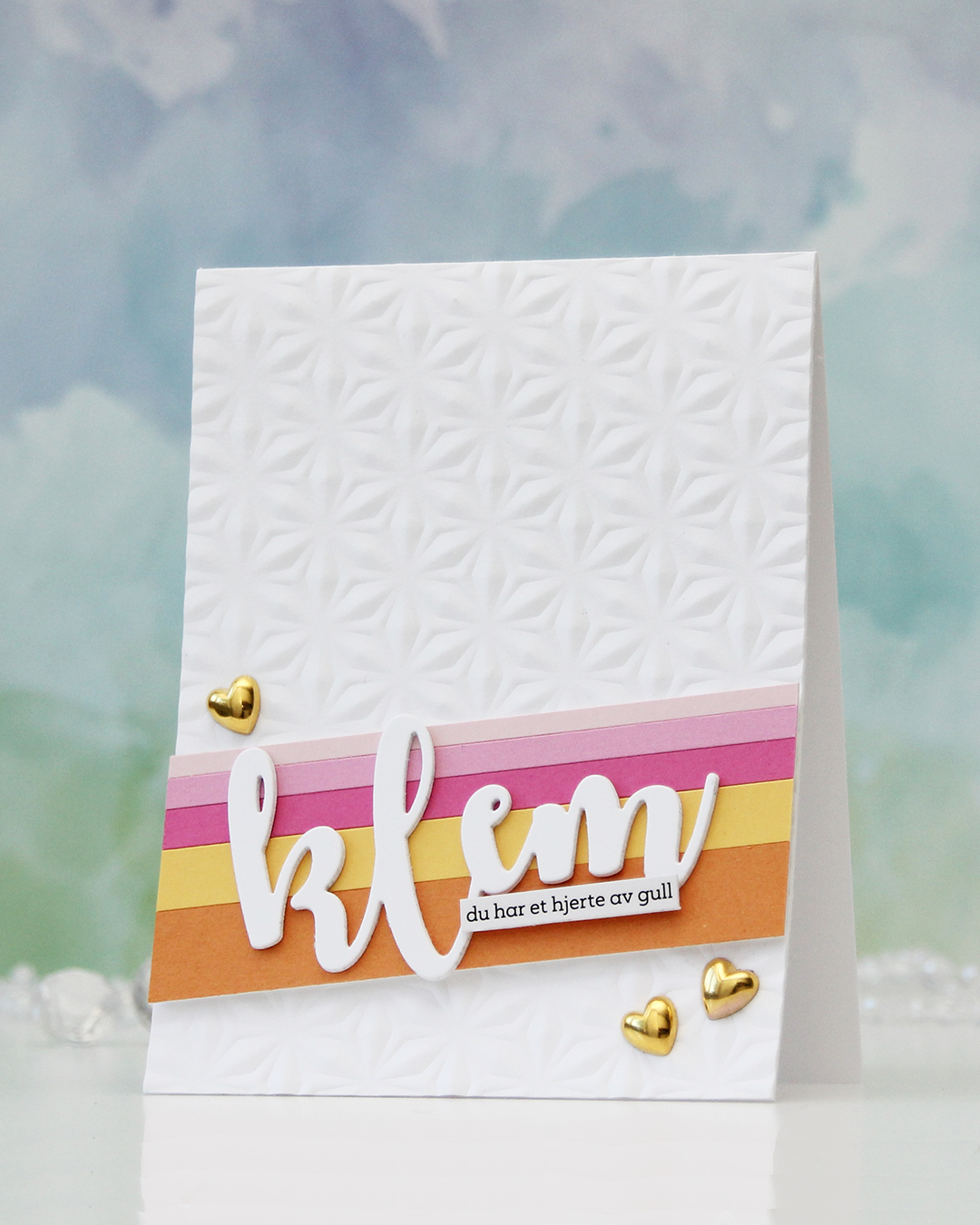 I die cut the word klem (hug) three times from white cardstock and stacked them for dimension. I usually stack four, but I was using a scrap to die cut from and there was only room for three with the piece I used. Three layers work too!
