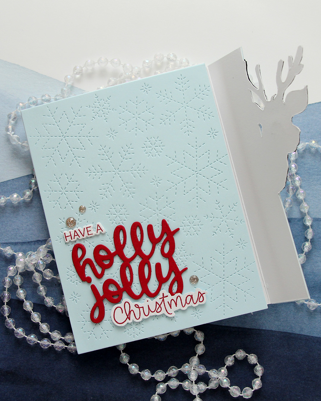 For the blue background, I used Powder cardstock from Concord & 9th. I used the Stitched Snowflake Backdrop die from Lawn Fawn to create some interest in the background. I die cut the a sentiment from the Jolly Holiday Greetings die set from Concord & 9th using Cranberry cardstock, also from C9. I stacked three layers, stamped part of a sentiment (have a) from the Christmas Wishes stamp set from My Favorite Things and the word Christmas from the Scripty Xmas stamp set from Mama Elephant, both in Cranberry ink. I die cut the have a with the coordinating die and fussy cut around the Christmas (there’s no coordinating die for this set), and put the three parts together to form a complete sentiment.