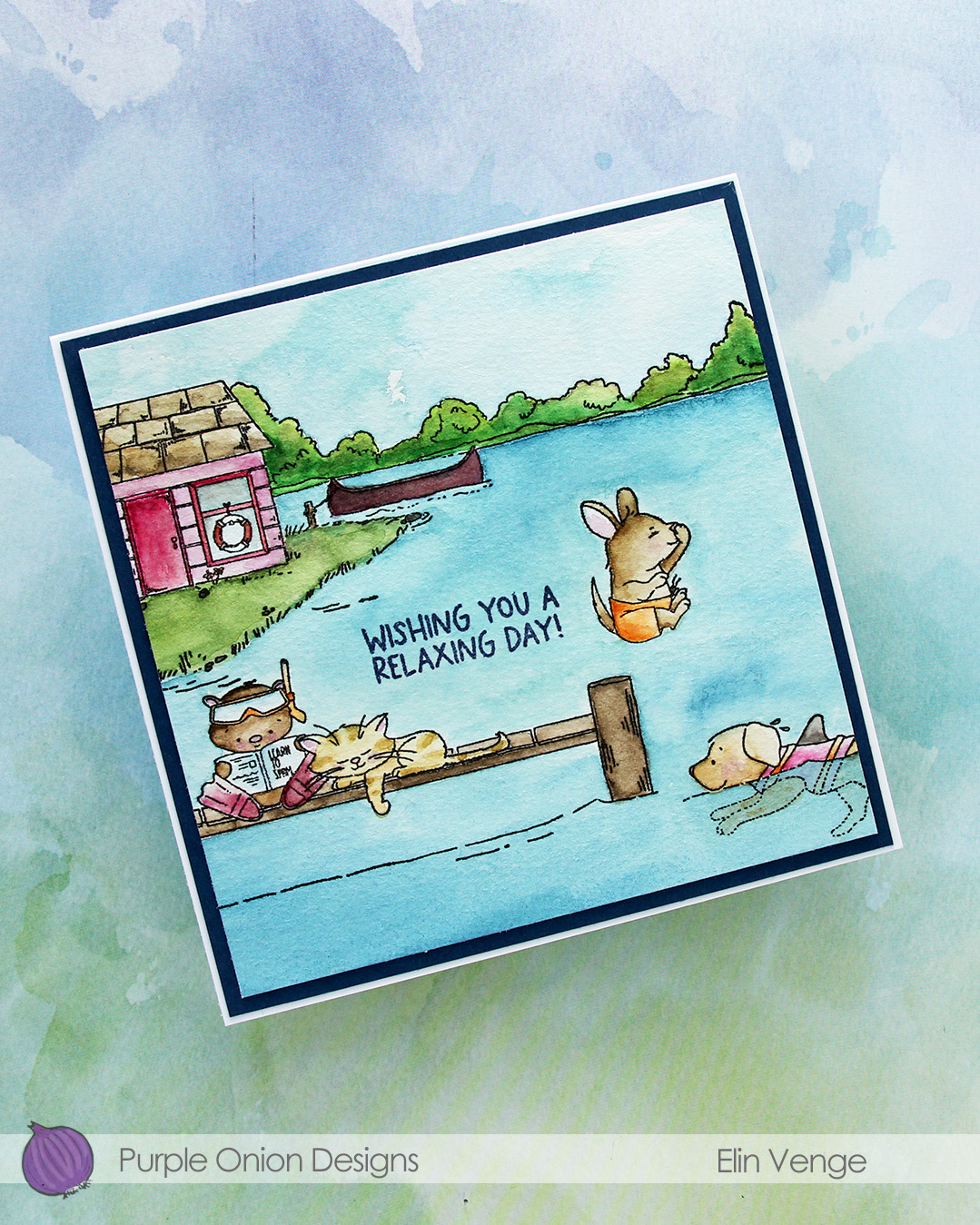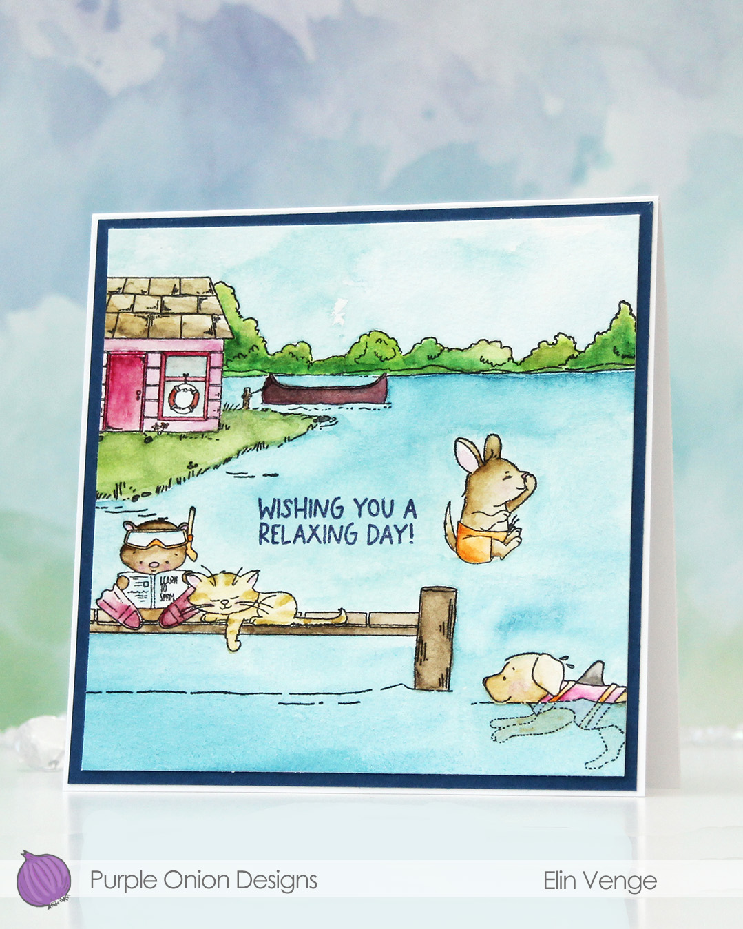 I created a scene with quite a few images from the Lakewood collection from Purple Onion Designs, illustrated by Holly Mabutas. Oliver reading to swim, Sleepy Sampson, Ollie swims, Bruno Jumps In, Boat house and Pier are all used in this one scene. It’s still not a very busy card, and I got away with only masking the guys on the pier.