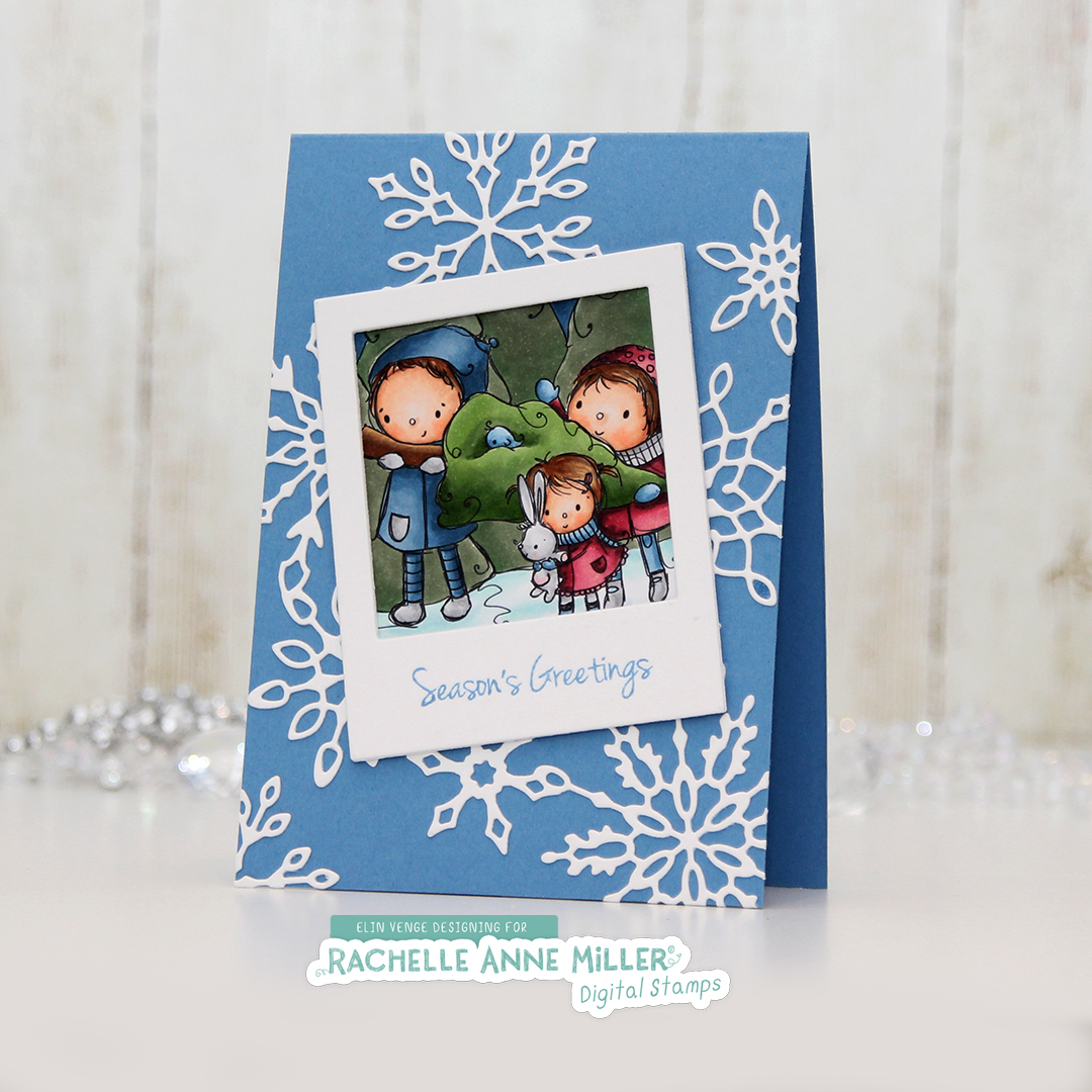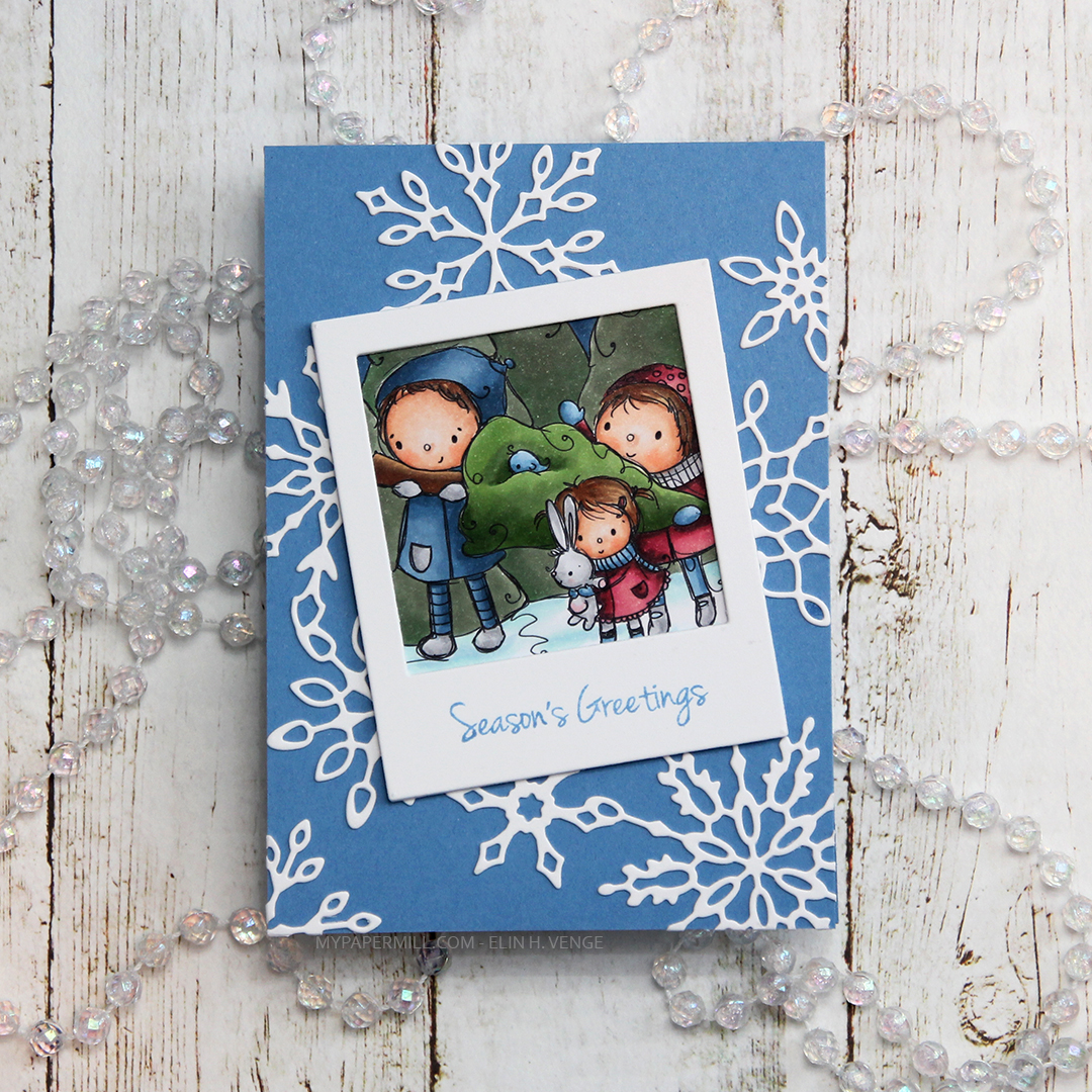 I die cut a chevron pattern from white card stock using a die from Papirdesign and adhered it directly to my patterned paper card front, before popping up the image on foam tape, and the sentiment on even more foam tape. Again I added sequins from the White Orchid Sequin mix to finish the card.