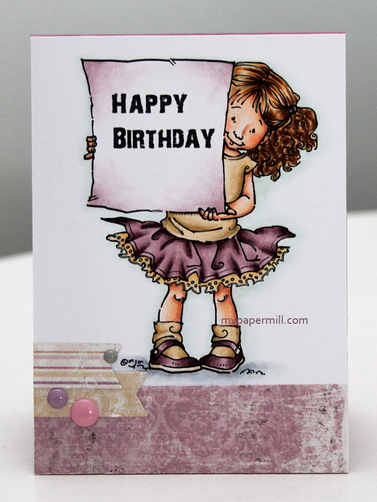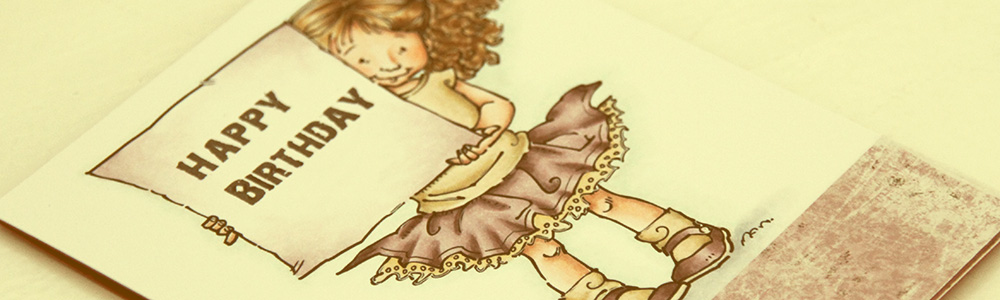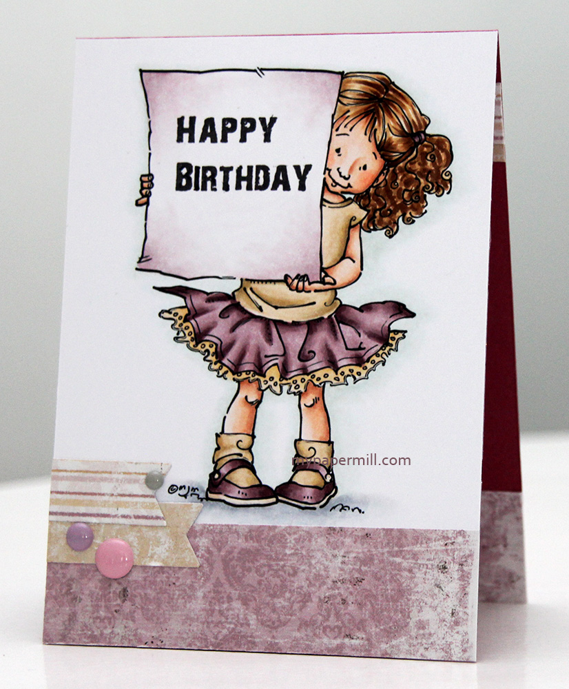 My card today is a very simple 4 bar card (3 1/2 x 4 7/8″) focusing on Girl with Sign. 4 bar is a card size where the card more or less makes itself. Because the area is so small, there’s not much room for embellishments, keeping the attention on the image. The card size is also handy when you want to use scraps of patterned paper you’ve got lying around.