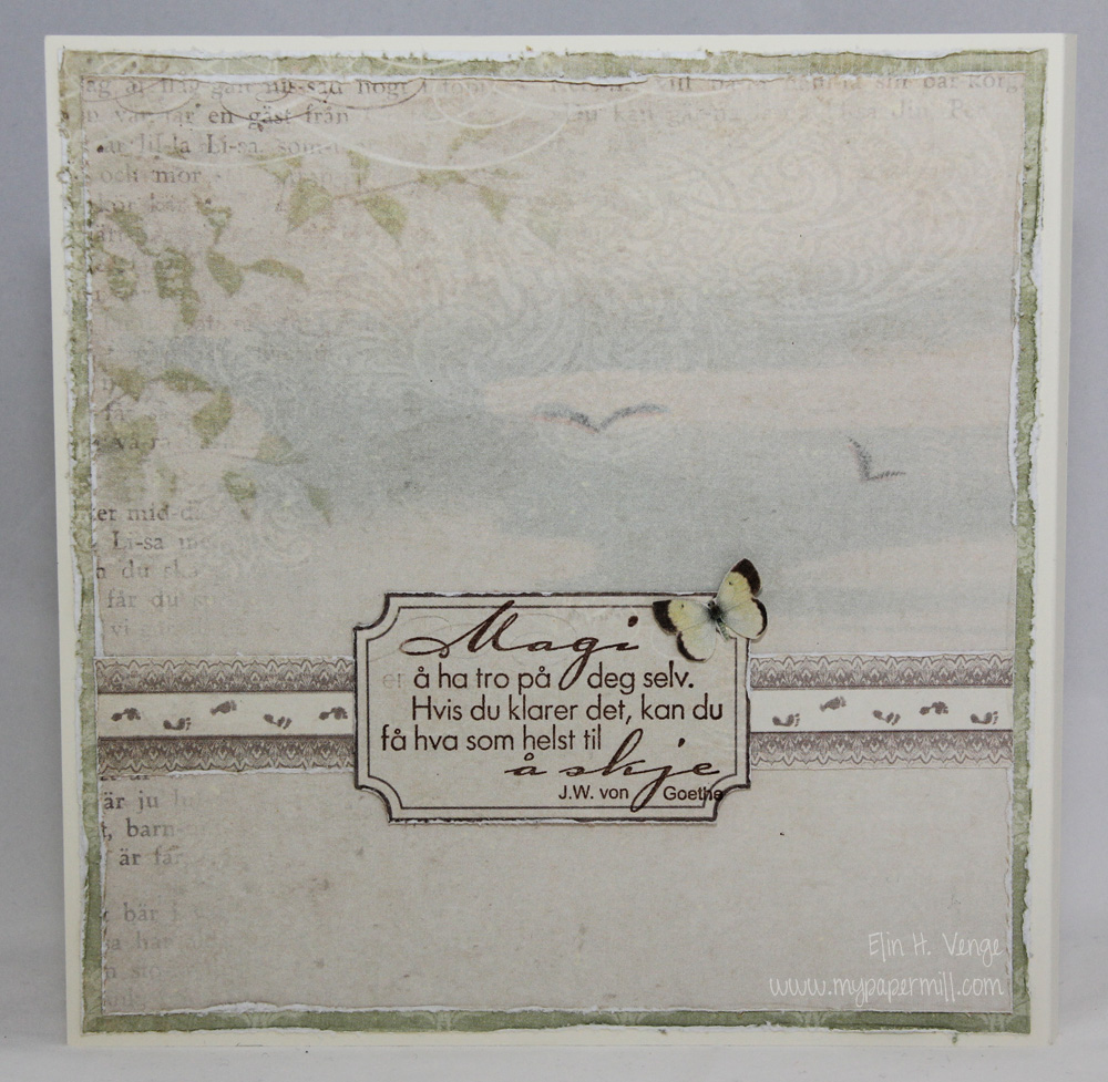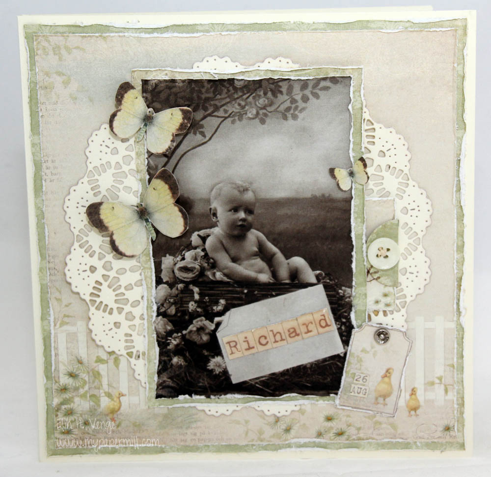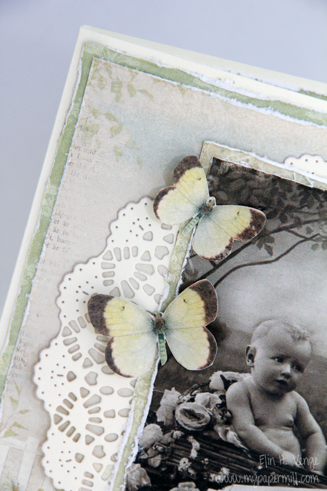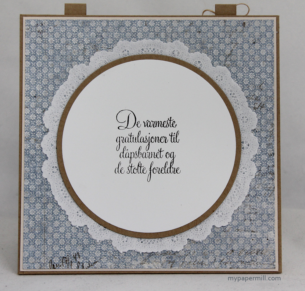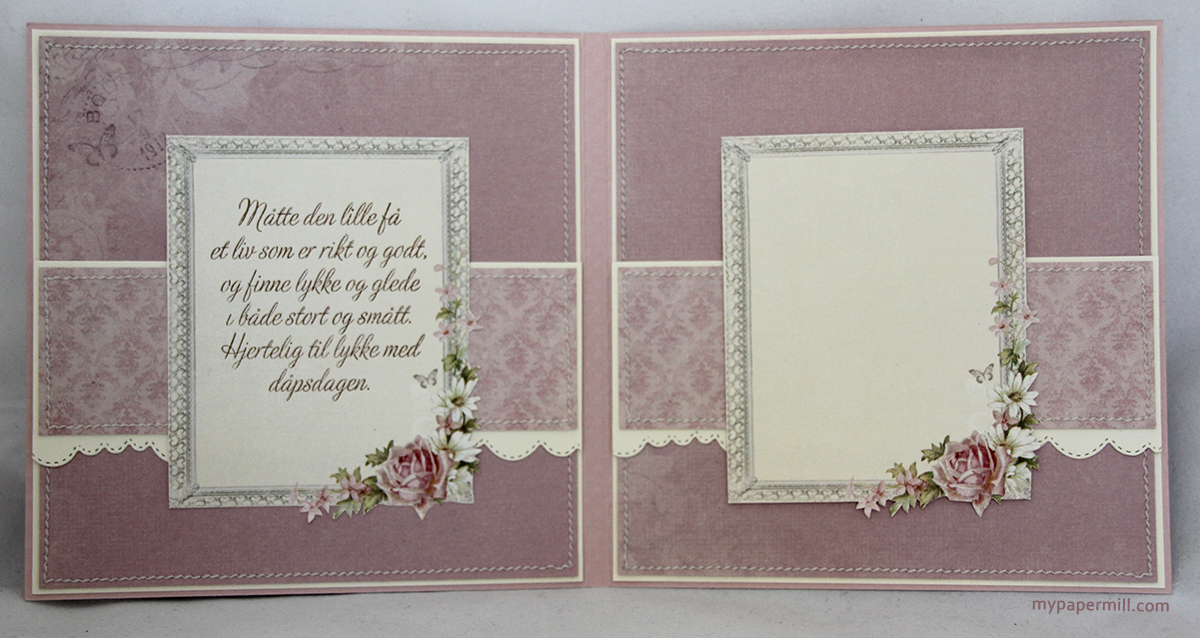Som vanlig har jeg ganske like innsider som fronten. Enda et dåpsstempel fra NSD. Jeg har tatt litt shabby white fran-táge rundt kanten på panelet og gjemt en liten lomme med mer fran-táge bak til penger.