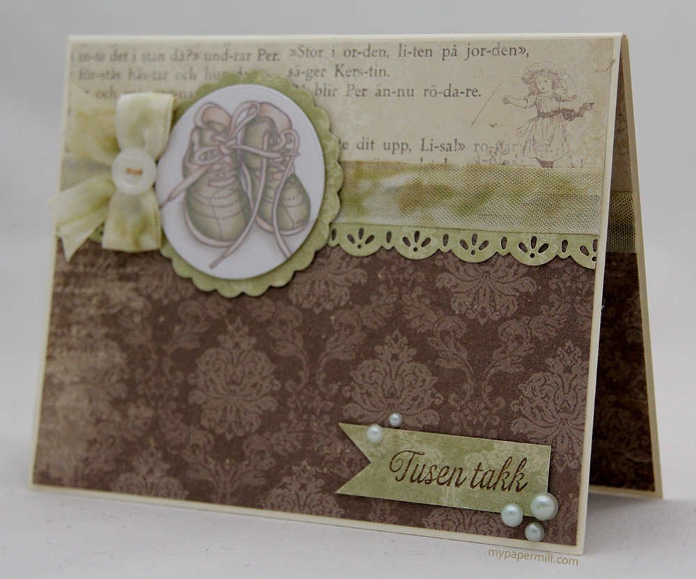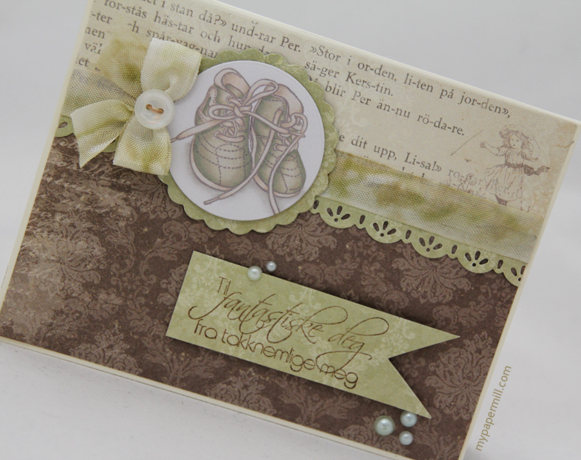 I made a christening card this time, for a little girl whose christening is in a couple of weeks. She was born three months early, but is now home from the hospital, ready for her christening. This image is just sweet enough and perfect for the occasion. She’s colored with Copics (duh!), and as usual I used patterned papers from Maja Design – this time it’s the Vintage Summer Basics collection. I used 1923, 1924, 1911, and 1912. I embellished with pink flowers from Kort & Godt, white roses from Wild Orchid Crafts, creme colored flowers from the North Star Design store and pink crystal drops from WOC.