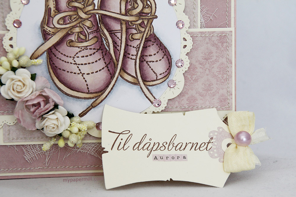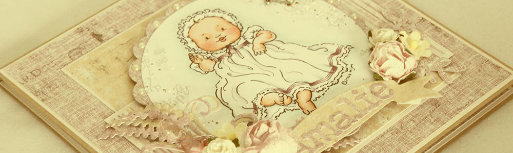 Det ble et dåpskort i dag, laget til en liten tulle som døpes om et par uker. Hun ble født tre måneder for tidlig, men er nå hjemme fra sykehuset og klar for dåp! Christening-motivet er akkurat passe søtt og passet perfekt for anledningen. Selvfølgelig er hun fargelagt med Copics, og jeg har som vanlig brukt ark fra Maja Design – denne gangen er det Vintage Summer Basics-kolleksjonen det har gått utover med arkene 1923, 1924, 1911 og 1912. Jeg har pyntet med rosa blomster fra Kort & Godt, hvite roser fra Wild Orchid Crafts, kremfargede blomster fra nettbutikken til North Star Design og rosa krystalldråper fra WOC.