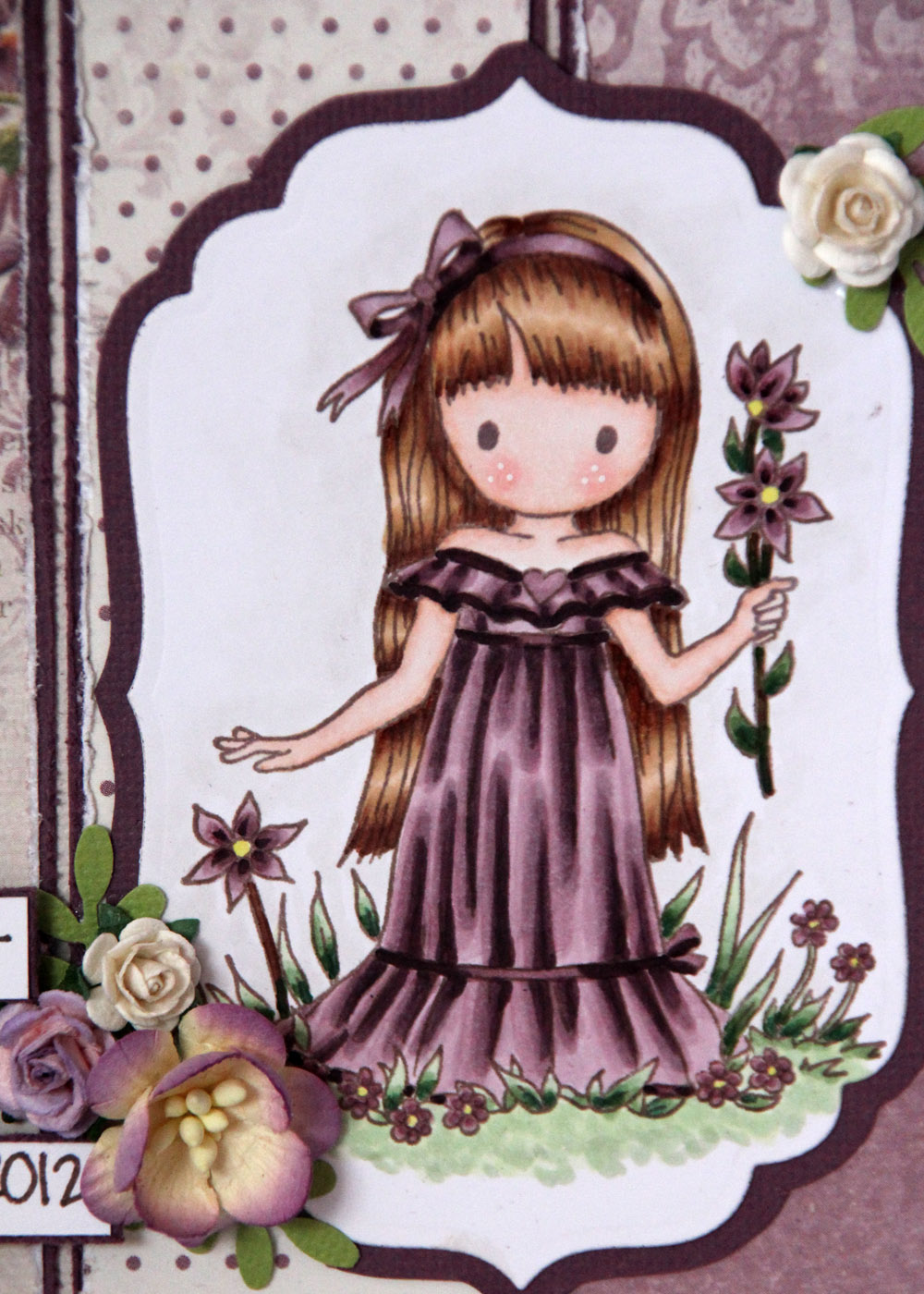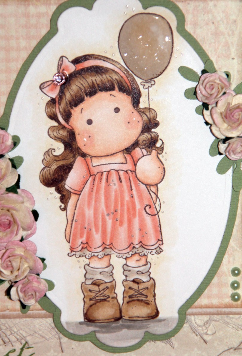 The image is “Playing Firefighter” from Mo Manning, as always colored with Copics. In addition I’ve stamped around the edges of the image with Inkido’s “Stars” stamp, I’ve used dabber from Adirondack (Aqua) for that. It worked great since I don’t have a stamp pad in the right color, but getting the acrylic paint off the stamp itself was a bit of a challenge.