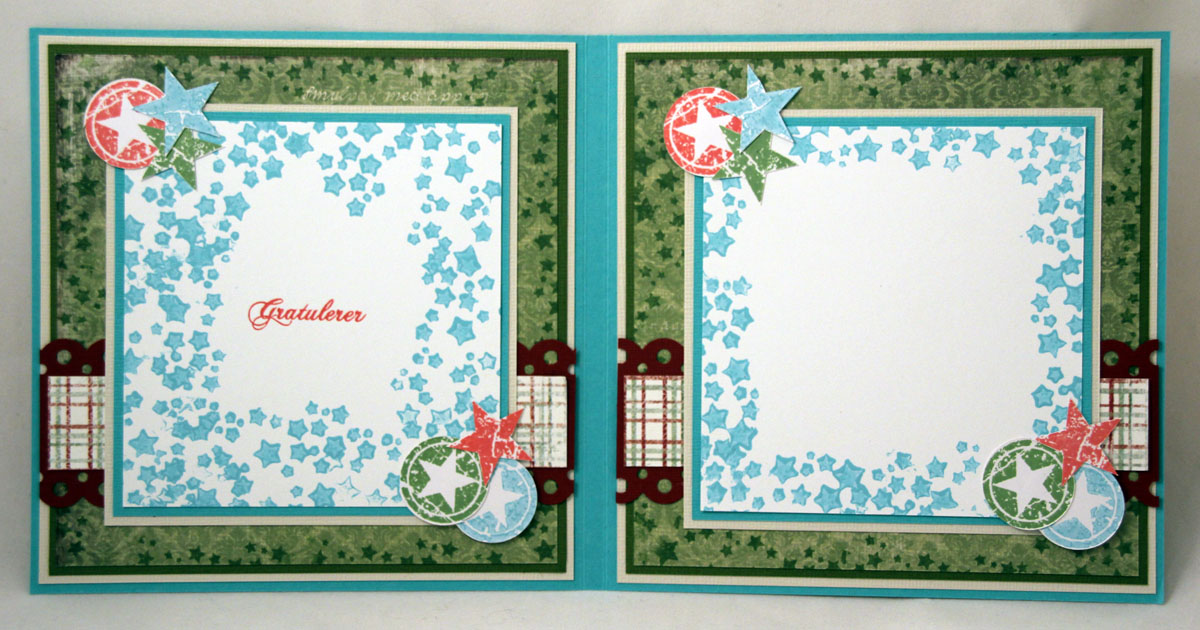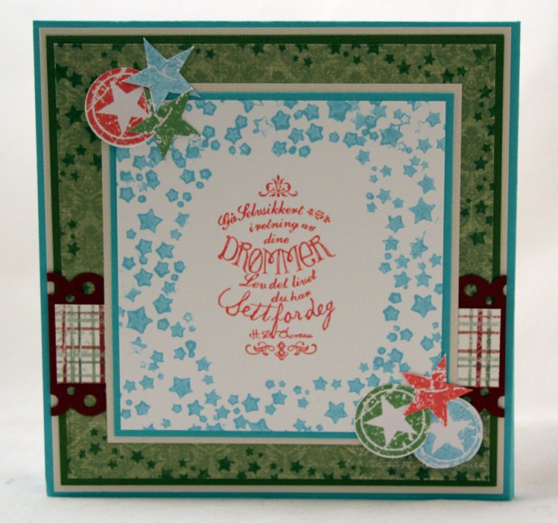 Har stanset ut en tag der jeg har stemplet det samme stjernestempelet som ellers og et dåpsstempel, samt skrevet navnet til dåpsbarnet og dåpsdatoen på, og festet litt turkis twine.