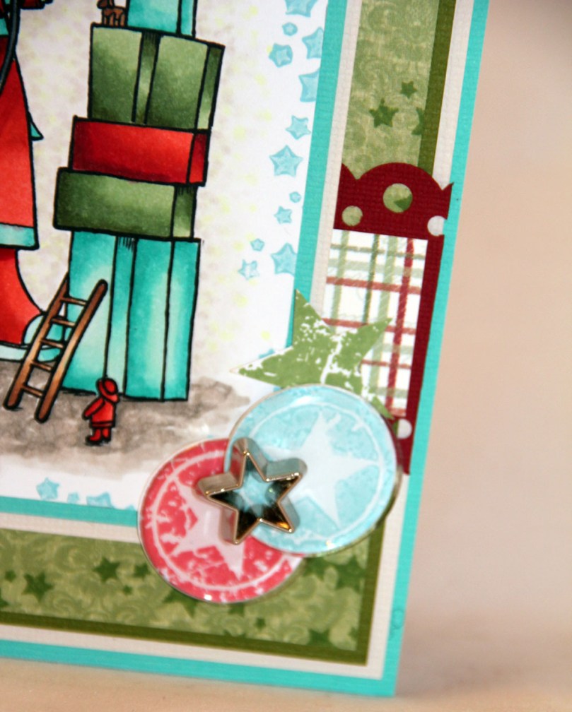 En liten titt på “pynten” på kortet. Har stemplet stjernestemplene fra “Psychedelic Grunge”-settet til Tim Holtz med den samme dabberen som på motivet, samt memento “Lady bug” og “Bamboo Leaves”. Fant frem noen pebbles jeg hadde liggende og satte oppå for litt dimensjon. En pepperkakestjerneform topper det hele.