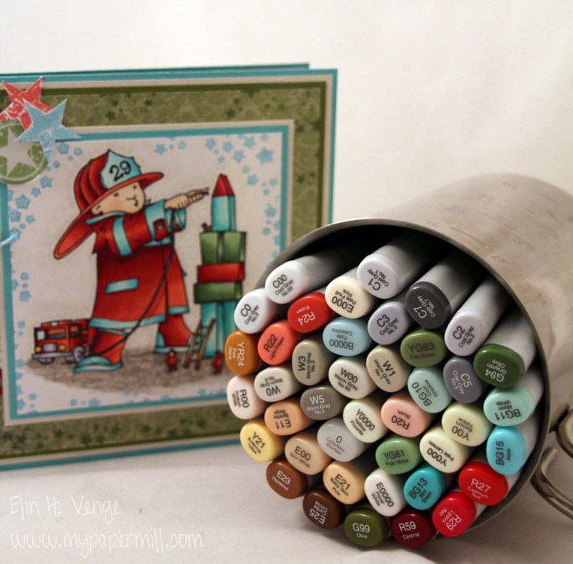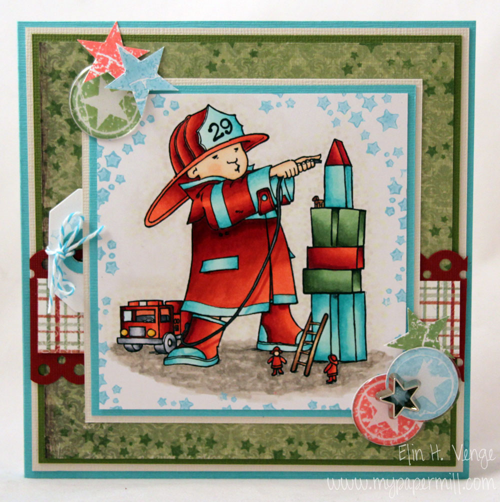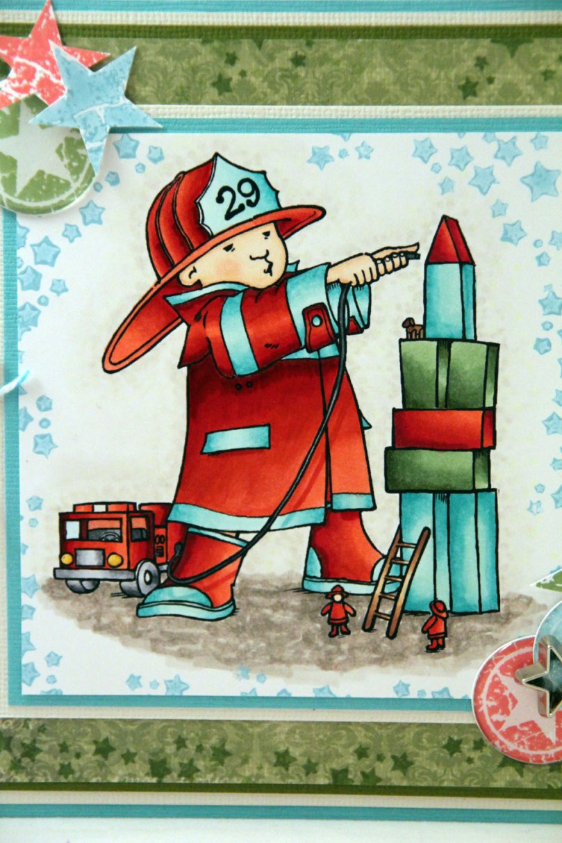Motivet er “Playing Firefighter” fra Mo Manning, som alltid har jeg fargelagt med Copics. I tillegg har jeg her stemplet rundt kantene på motivet med Inkidos “Stars”-stempel, har brukt dabber fra Adirondack i fargen Aqua til det. Funket fint siden jeg ikke har stempelpute i riktig farge, men det var en ekstra liten utfordring å rense akrylmalingen fra stempelet.