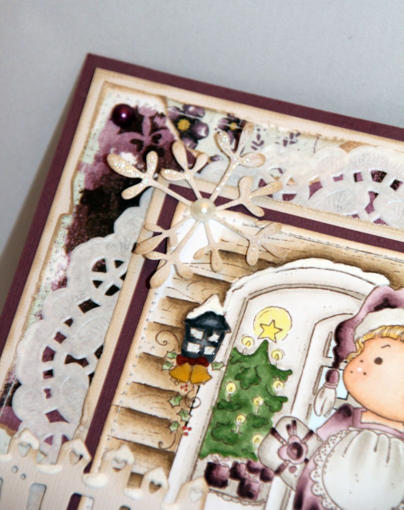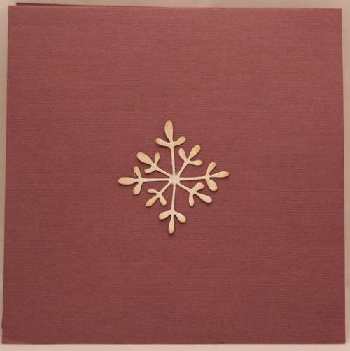 Snøflaket er en die fra Magnolia og kommer i en pakke med en misteltein-kvist. Den har også blitt svertet med Creamy Brown, før den har fått et lag med Stickles (Star Dust) og til slutt en halvperle fra Kort og Godt.