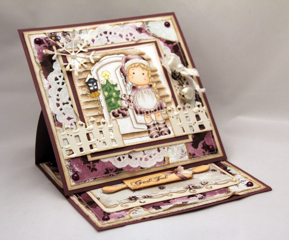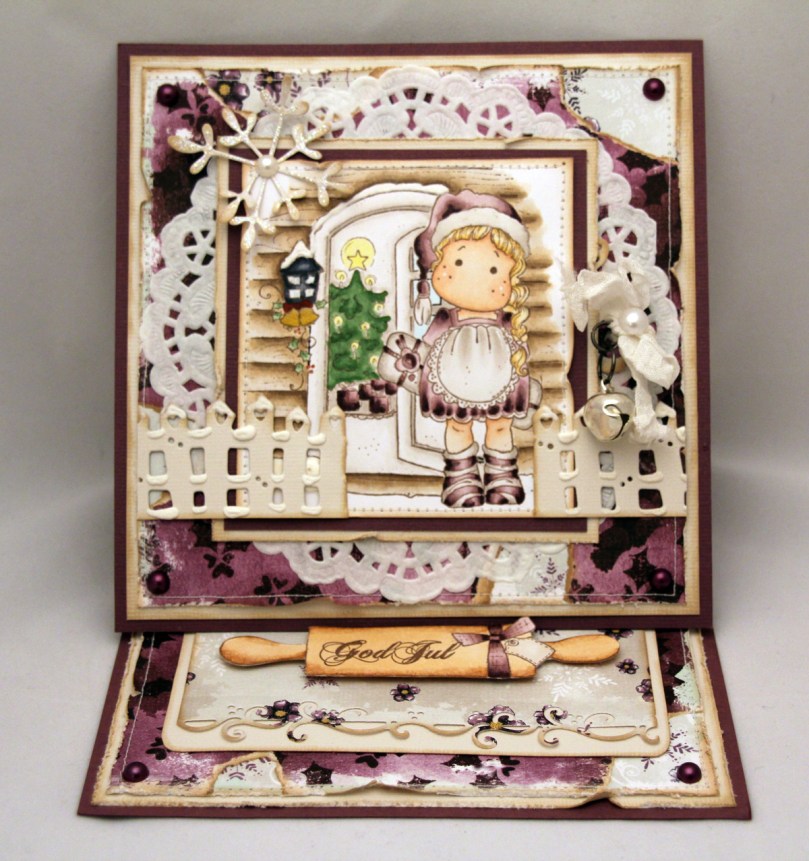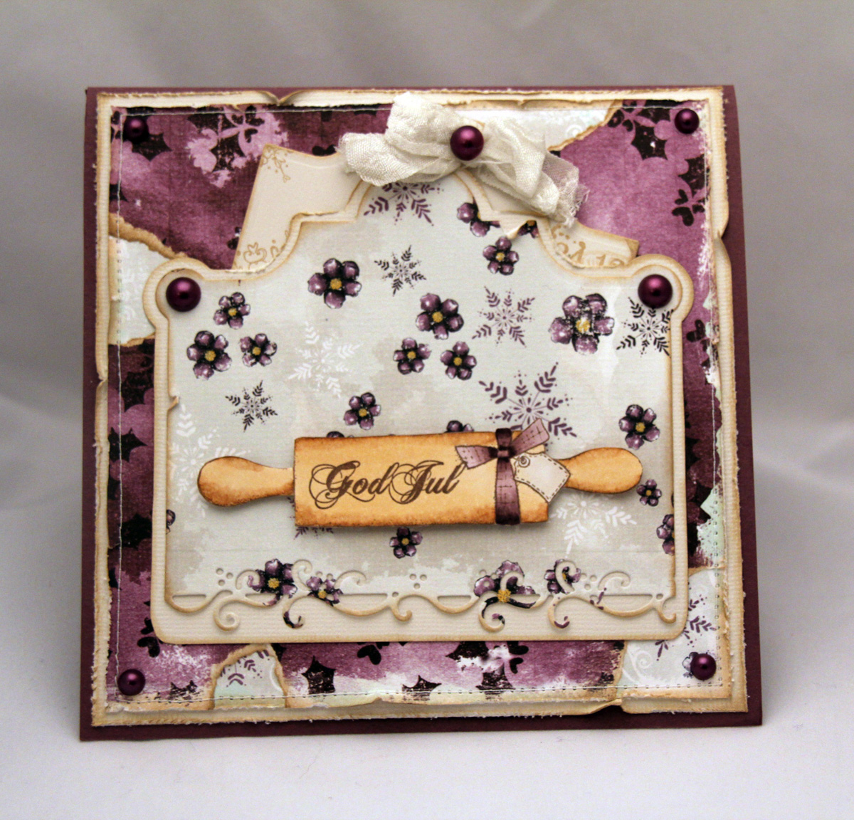 Jeg har laget et lilla julekort (!) med papirer, motiver og dies fra Magnolia (hovedsaklig). Alle som kjenner meg vet at jeg egentlig bare lager blå, brune og hvite julekort, men nå har jeg slått ut håret skikkelig, og laget et i utradisjonelle farger. De fantastiske julepapirene til Magnolia ba om å bli brukt, og da hadde jeg ikke noe valg. Jeg deltok i denne ukens oppgave i Kort-O-Mania på scrapping.no, som var “staffelikort” og havnet i finalen. Jeg er like forundret hver gang det skjer, det er jo så mye fint som lages!!!