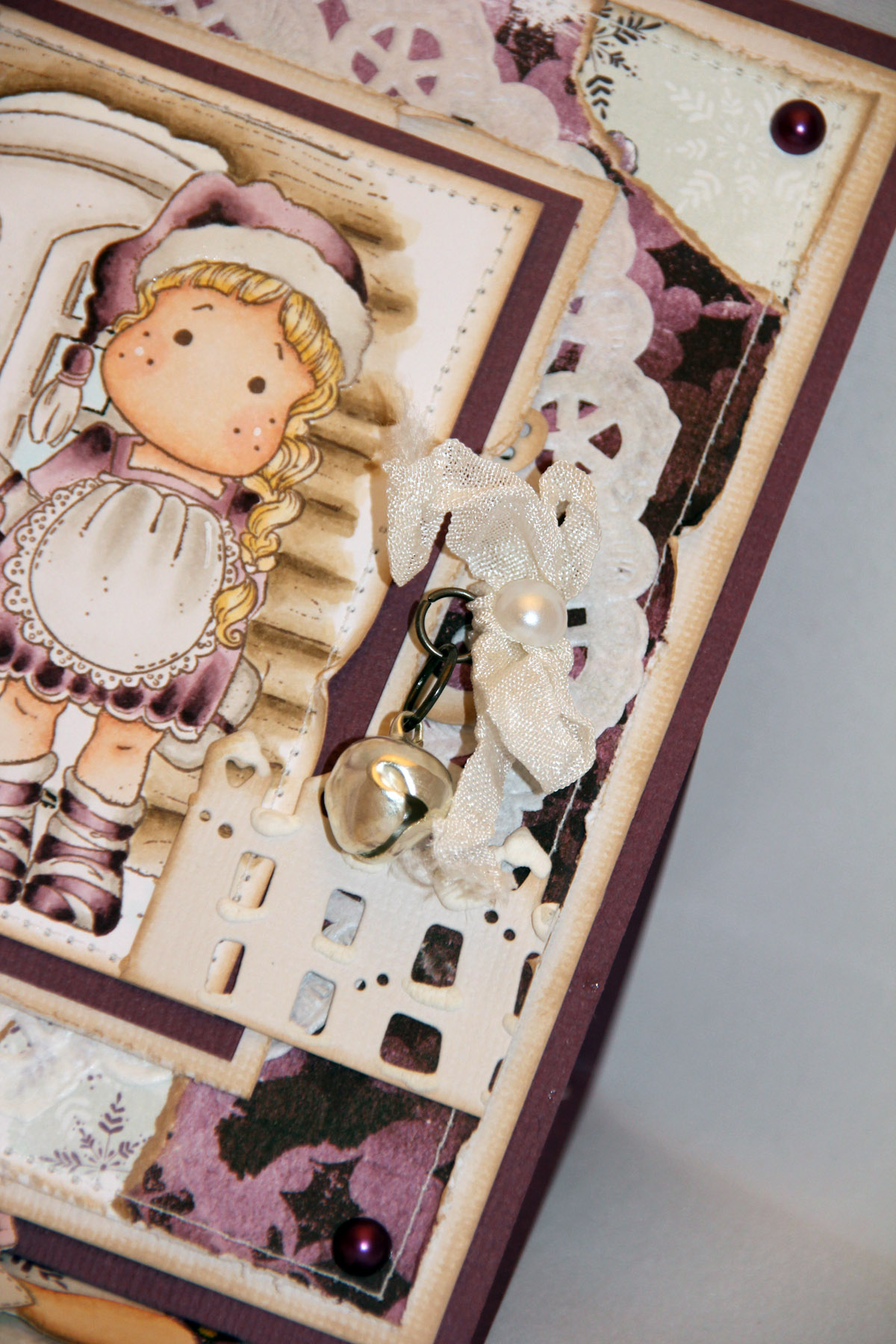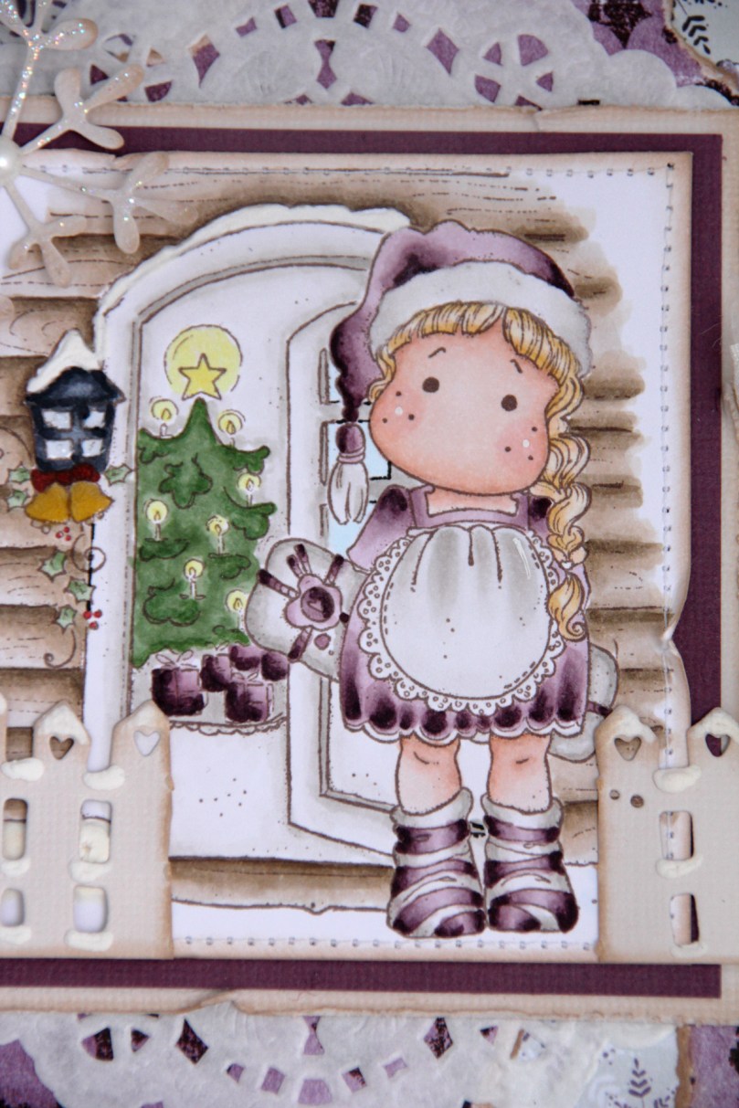 Som alltid er Tilda (Sweet Christmas Dreams – Tilda Hiding Gift, bakgrunn Sweet Christmas Dreams – Welcome to a Sweet Christmas) fargelagt med Copics, fargene jeg har brukt finner du nederst i dette innlegget. Har også brukt snow marker på gjerdet (Lovely Fence-die fra Magnolia), over lykta og over døren, i tillegg til crackle accents på bjellene. Alle paneler er svertet med Cat’s Eye Creamy Brown.