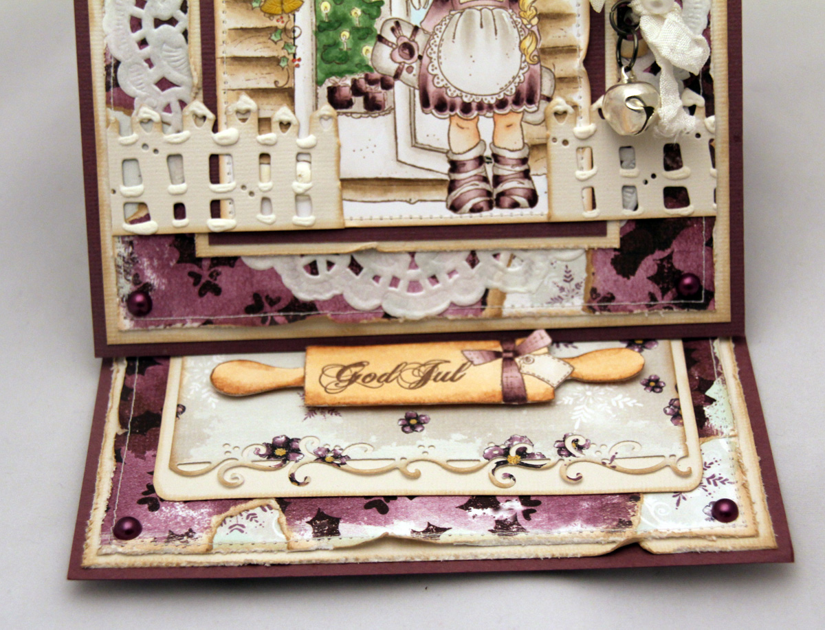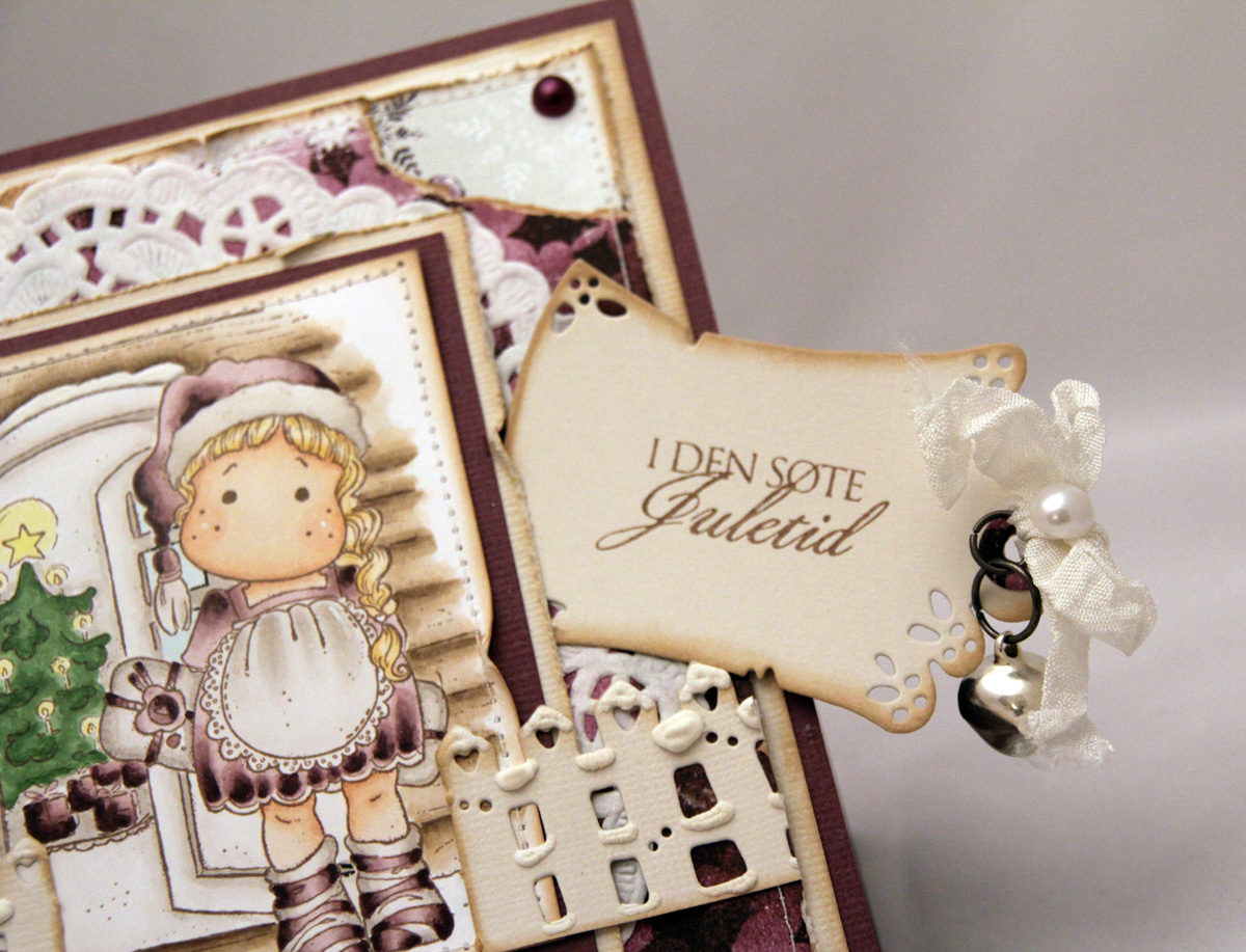 Som stopper har jeg brukt denne kjevlen (også et Magnoliastempel) som jeg har stemplet “God Jul” (Kort og Godt) oppå, en idé jeg rappet fra et kort Trine har laget, den dama mestrer alle stiler, ta en titt i bloggen hennes og se. Den søte kanten på det grå mønsterarket er nok en ny die fra Magnolias Sweet Christmas Dreams-kolleksjon, Swirly Lace. Utrolig fin!!!