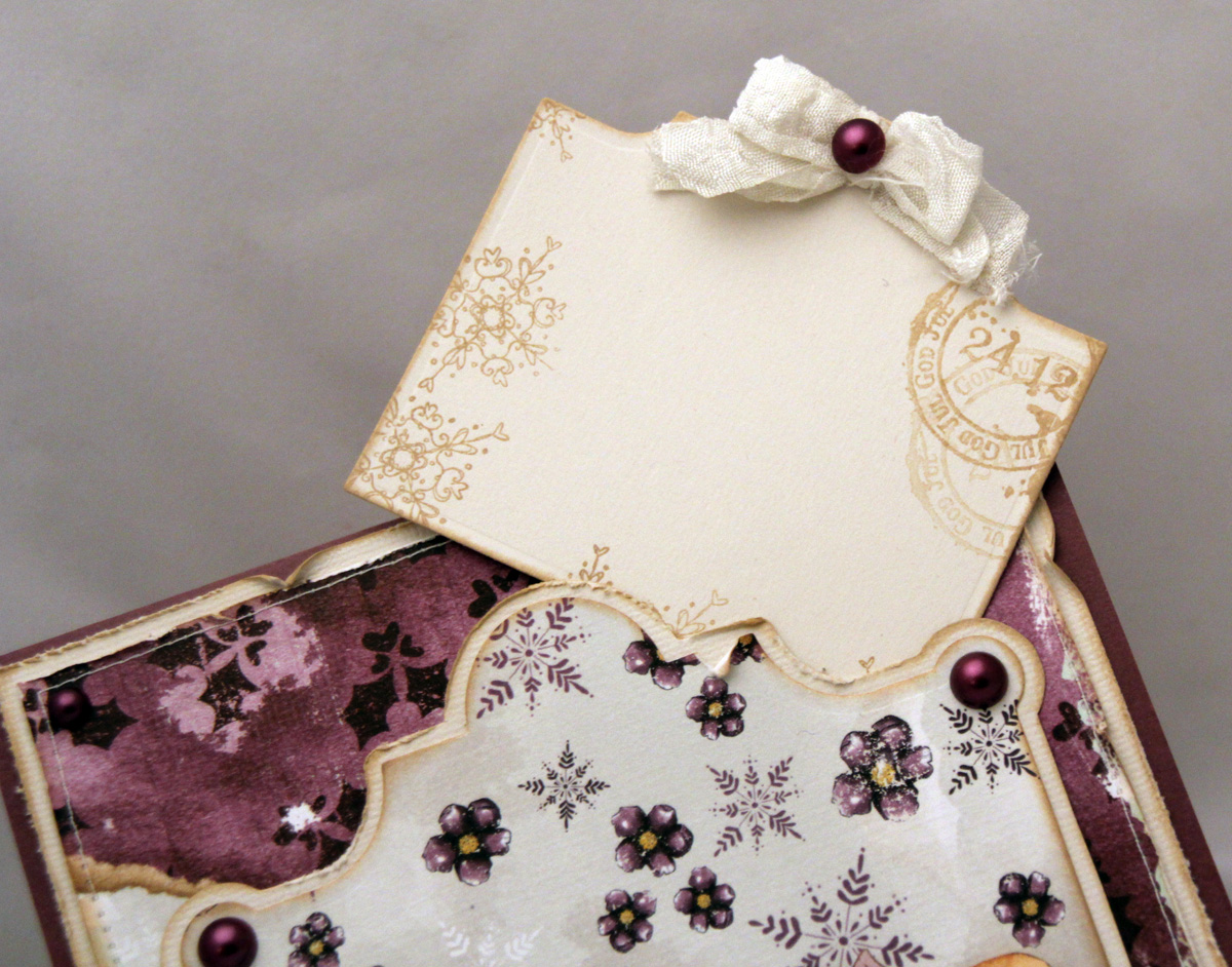 Denne tagen er også laget med en Spellbinders Grand Creative Book Pages die. Her har jeg stemplet snøflak fra… ja, du gjettet riktig, nok en gang Magnolia. Går forsåvidt og sikler på de nye Magnoliasnøflakstemplene (si det ti ganger fort) som er like som de lilla snøflakene på det grå mønsterarket, er de ikke fine??? MÅ ha de, bare MÅ ha de!!! Tagen har også blitt stemplet med 24.12-poststempelet til Inkido, det er en av mine favoritter, tagen har også blitt svertet i kantene med Creamy Brown. En dobbel sløyfe av Hug Snug med en halvperle fra Kort og Godt gjør tagen komplett.