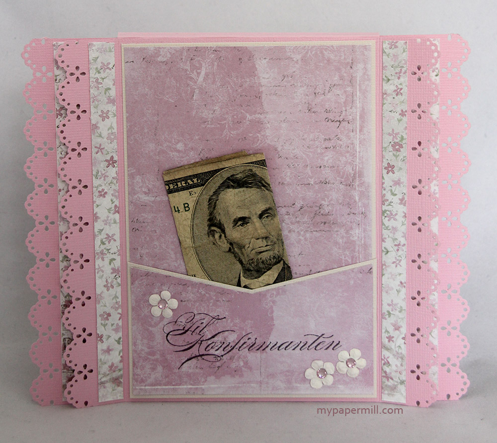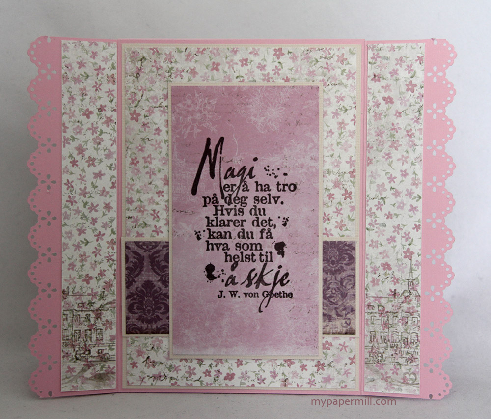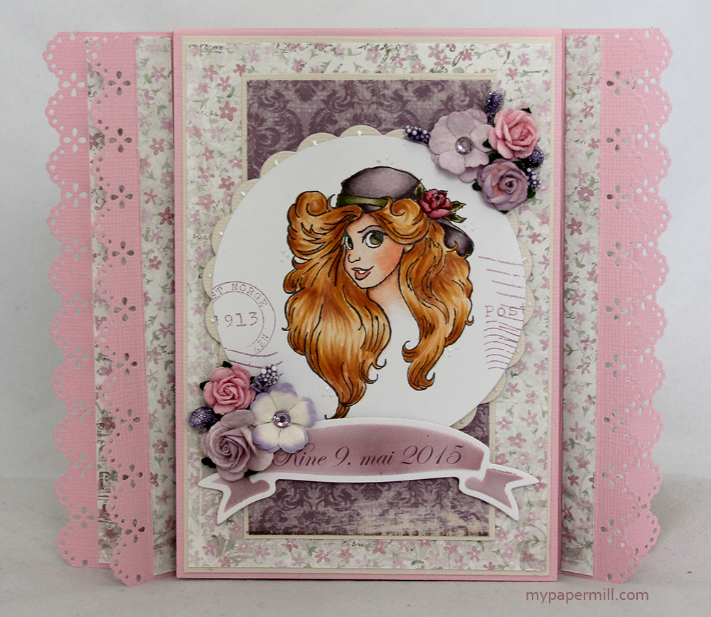 Jeg er litt lei de vanlige 6×6″-kortene, så denne gangen har jeg prøvd meg på et tryllekort. Det var Marianne som først kom opp med denne bretteteknikken, men jeg har justert målene til å passe mitt kort, som er ca. 7×5″ på frontpanelet. Med “vingene”, som er laget med en MS punch (Lace Heart), blir det litt bredere. Bestiller ville gjerne at jeg skulle bruke dette motivet fra Make It Crafty (“Flirty Seniors” – har brukt det på et kort hun har bestilt tidligere også), de er jo litt søte der de sitter da. Selve motivet er fargelagt med Copics, og både det og panelet bak er stanset ut med Spellbinders Grand Labels Four-dies. Jeg har satt på haugevis av blomster fra WOC og Kort og Godt, endel av dem har blitt airbrushet for anledningen med E19. De fantastiske papirene er fra Pion sin “Från Mitt Hjärta II”-kolleksjon, har brukt av arkene Bårder, Brevduvor (6×6″), Klippark og Rosenram. Teksten på banneret er også skrevet med Copic E19, i tillegg til at jeg har satt på et par hjerteklistremerker i sølv.