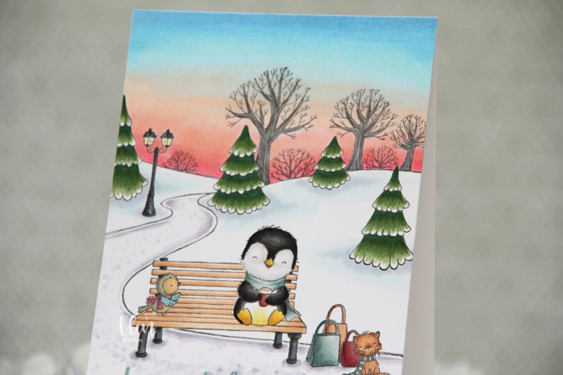 I originally planned on creating a regular portrait oriented A2 card with this image, but I had this idea of another igloo in the distance, and it kind of evolved from there. I don’t usually create my own backgrounds for cards (I like background stamps that do all the work for me), but I had a blast with this one. Keeping the colors to a minimum certainly helped. I only used five Copics for the entire background.