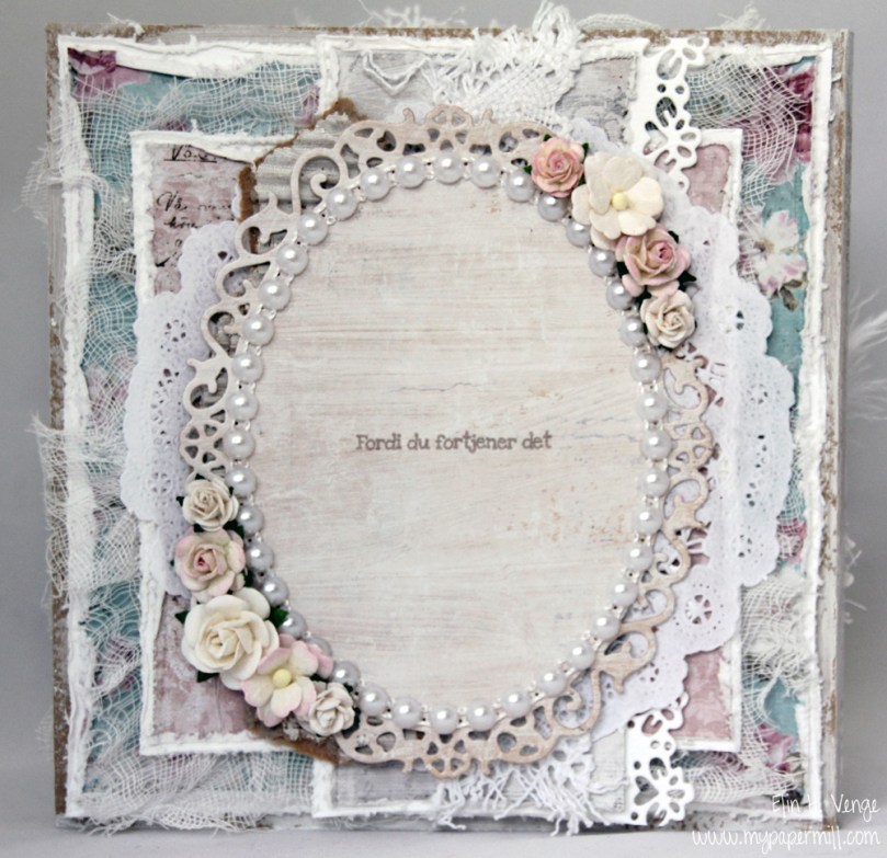 ET0516 shabby chic bestilling Nina 51 front skrått liggendeJeg syns lyse papirer er viktig i shabby chic-stilen, og disse arkene fra Inkido var midt i blinken. Det rosa mønsterarket, som for det meste er skjult bak kakeservietten, har jeg til og med duset ned litt med gesso. Jeg har også brukt gesso sporadisk i kantene da kortet var ferdig. Kantene er også sydd på symaskin, og jeg har rufset, brukt blonde, perler, blomster og kakeserviett, alle viktige shabby chic-elementer.