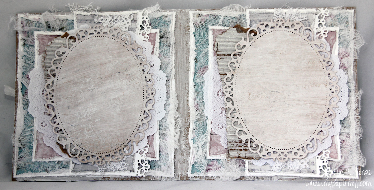 • gamle knapper og ark fra en gammel bok/noteark – jeg har knapper, men de er ikke gamle (forøvrig malt med hvit distress crackle paint). Det ene mønsterarket (gjemt bak blonde, kakeserviett, hoved”motiv” og delvis også bølgepapp) er et noteark fra Maja Design, men jeg har malt over det med uttynnet crackle paint, så mønsteret er ikke så tydelig.