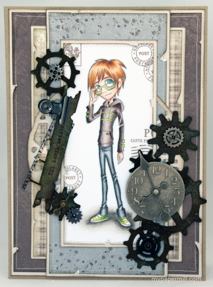 konfirmasjonskort Oscar frontForeldrene mine var i konfirmasjon på vårparten en gang, så da lagde jeg dette kortet. Pion og Tim Holtz i skjønn forening, med et fargelagt motiv fra Tickled Pink på fronten. Akkurat passe røft til en guttekonfirmant, mener nå jeg.