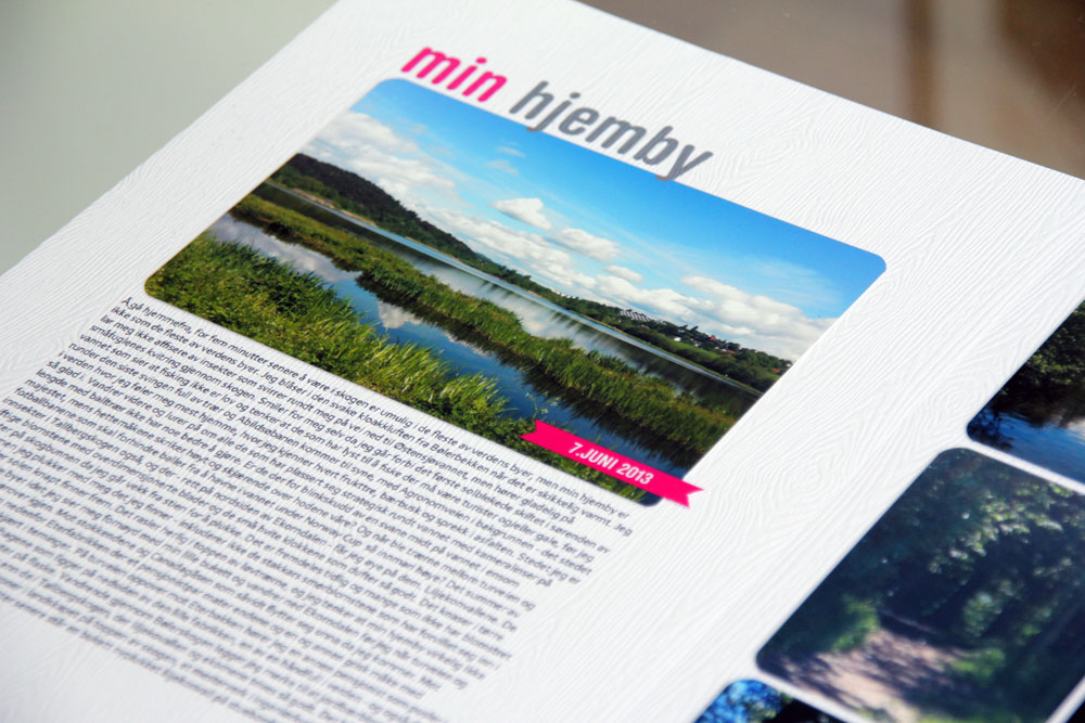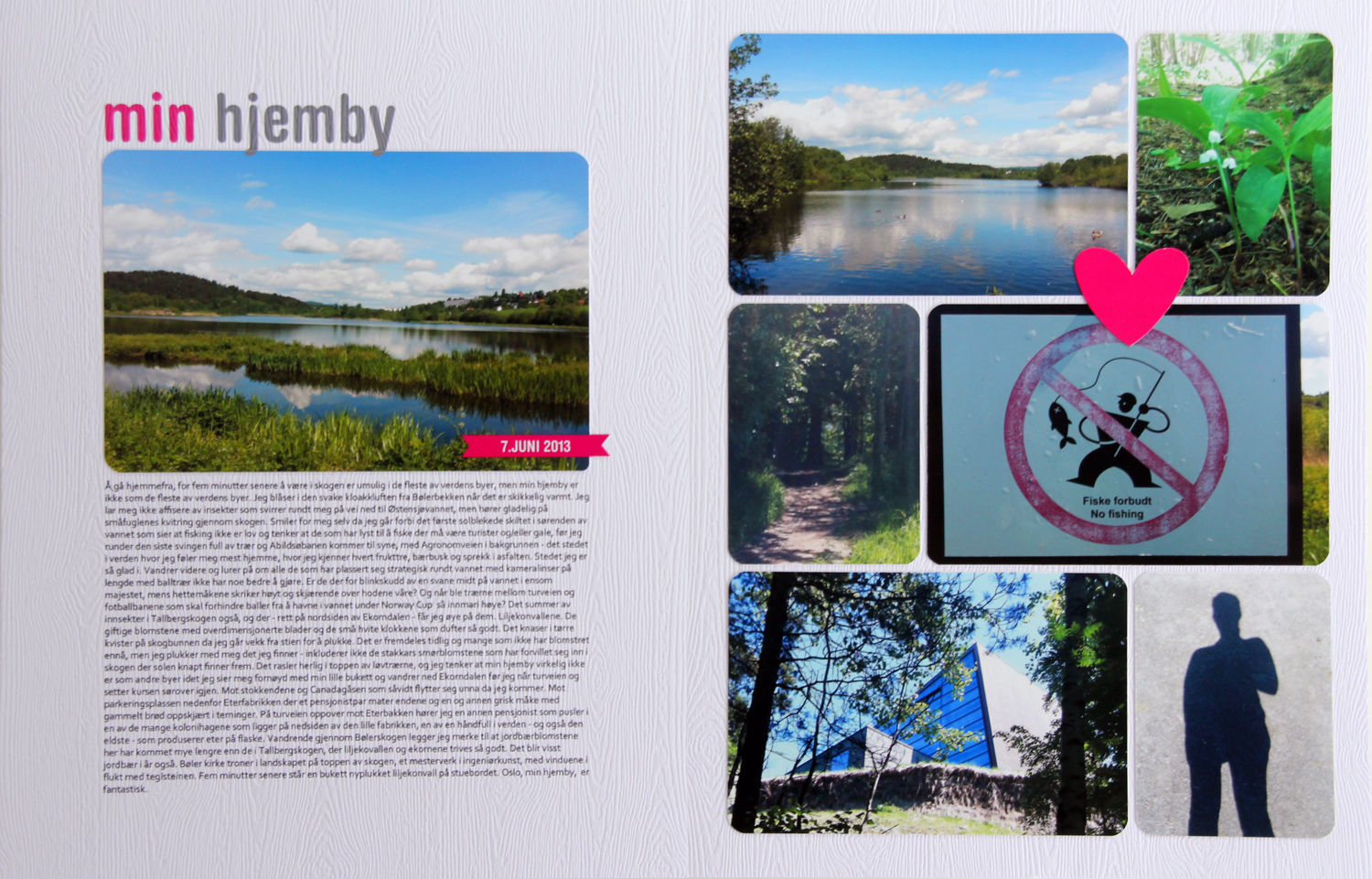 min hjemby 1Mitt neste prosjekt er noe så uvanlig som en LO! Jeg lager ikke mange layouts, og de jeg lager er stikk motsatte av kortene mine: veldig enkle med lite stæsj. Jeg fokuserer heller på bilder og historier enn på mønsterark og pynt når jeg lager LOer. Dette er faktisk den eneste LOen jeg lagde i år, men jeg liker den ikke mindre av den grunn. Når jeg leser teksten kan jeg drømme meg tilbake til sol og sommer, knasing av tørre kvister under føttene mine i skogen, og synet av endene som mates ved Østensjøvannet, jeg digger det!