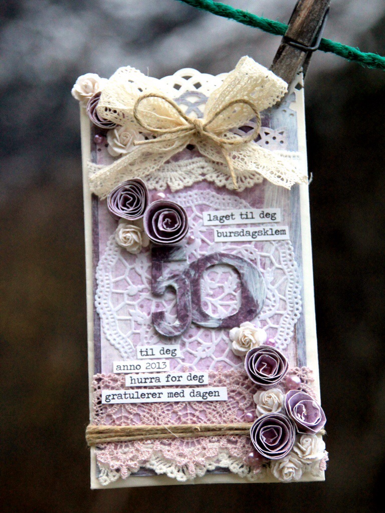 Runde bursdager fortjener kort. Ikke at andre bursdager ikke fortjener kort, men det er jo noe spesielt med disse runde. Med planen klar i hodet, kortet halvferdig og litt scrappesaker i bagen på tur litt vestover tidligere i uken ble dette kortet til. Ikke et veldig typisk meg-kort, men det er lett å se hvor inspirasjonen er hentet. Dette posekortet er egentlig en ren lift av en tag Mona har laget, alt fra hjemmesnurrede roser til gesso på tallene. Noen ganger må det være lov å lifte litt.