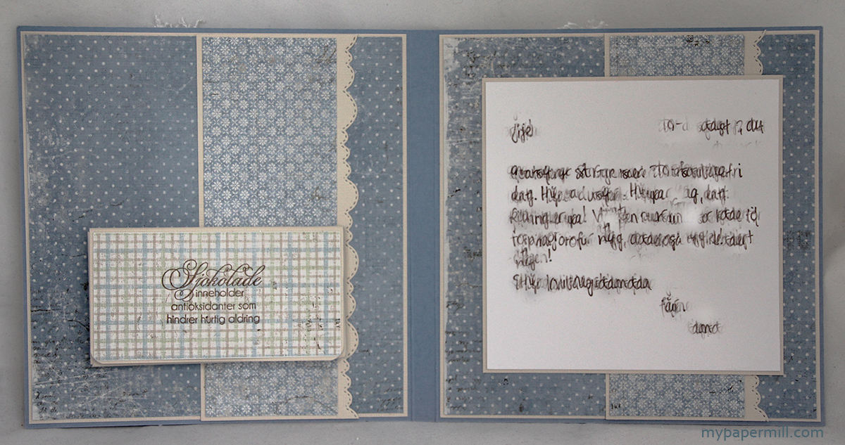 innsiderSiden utsidene av kortet er stæsjet med masse rufsing lagde jeg veldig enkle innsider denne gangen. Personlig hilsen på høyresiden (lekt litt med i Photoshop for at den skal være uleselig – resten av verden trenger ikke å se hva jeg skrev til Jill ;)), mens venstresiden har en liten eske med lomme til en eventyrsjokolade. Eventyrsjokoladen bygger litt, så istedenfor min vanlige rygg på 1/4″ har jeg brukt 3/8″ for at kortet ikke skulle sprike.